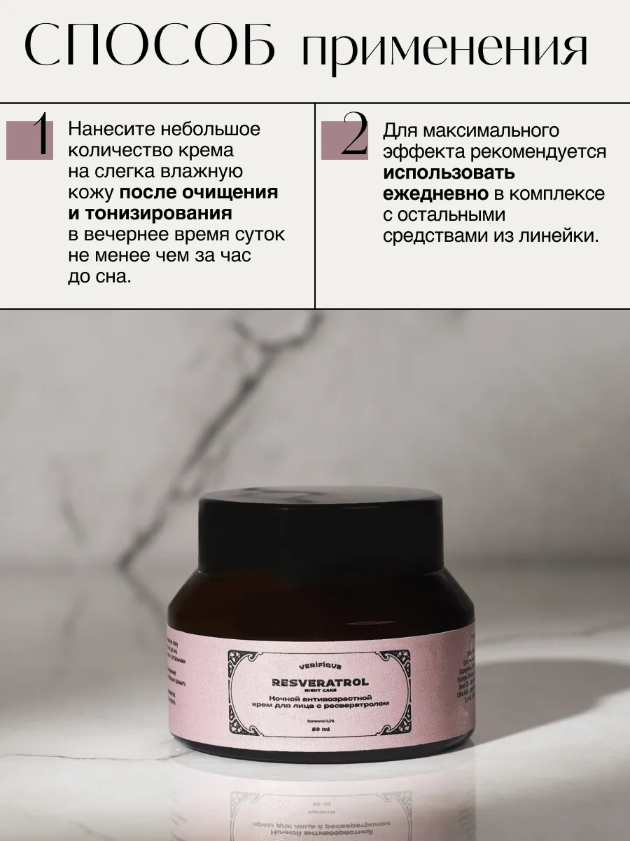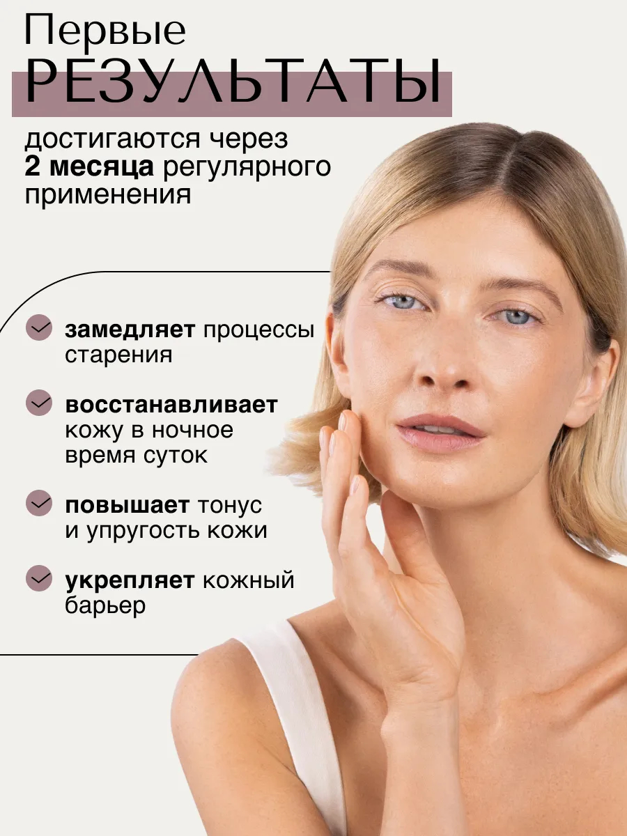 Ресвератрол защищает собственный коллаген и эластин от возрастного разрушения. DMAE (диметиламиноэтанол тартрат) способствует улучшению тонуса и упругости кожи. Гидролизованный коллаген разглаживает мелкие морщинки и увлажняет кожу. Масло асаи восстанавливает кожу в течение ночи и устраняет последствия дневного стресса. Церамидный комплекс восстанавливает и укрепляет кожный барьер.
