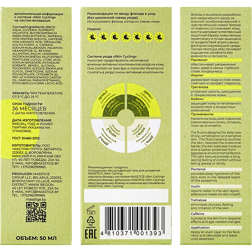 Легкими массажными движениями нанесите флюид на чистую сухую кожу, избегая области вокруг глаз.Состав