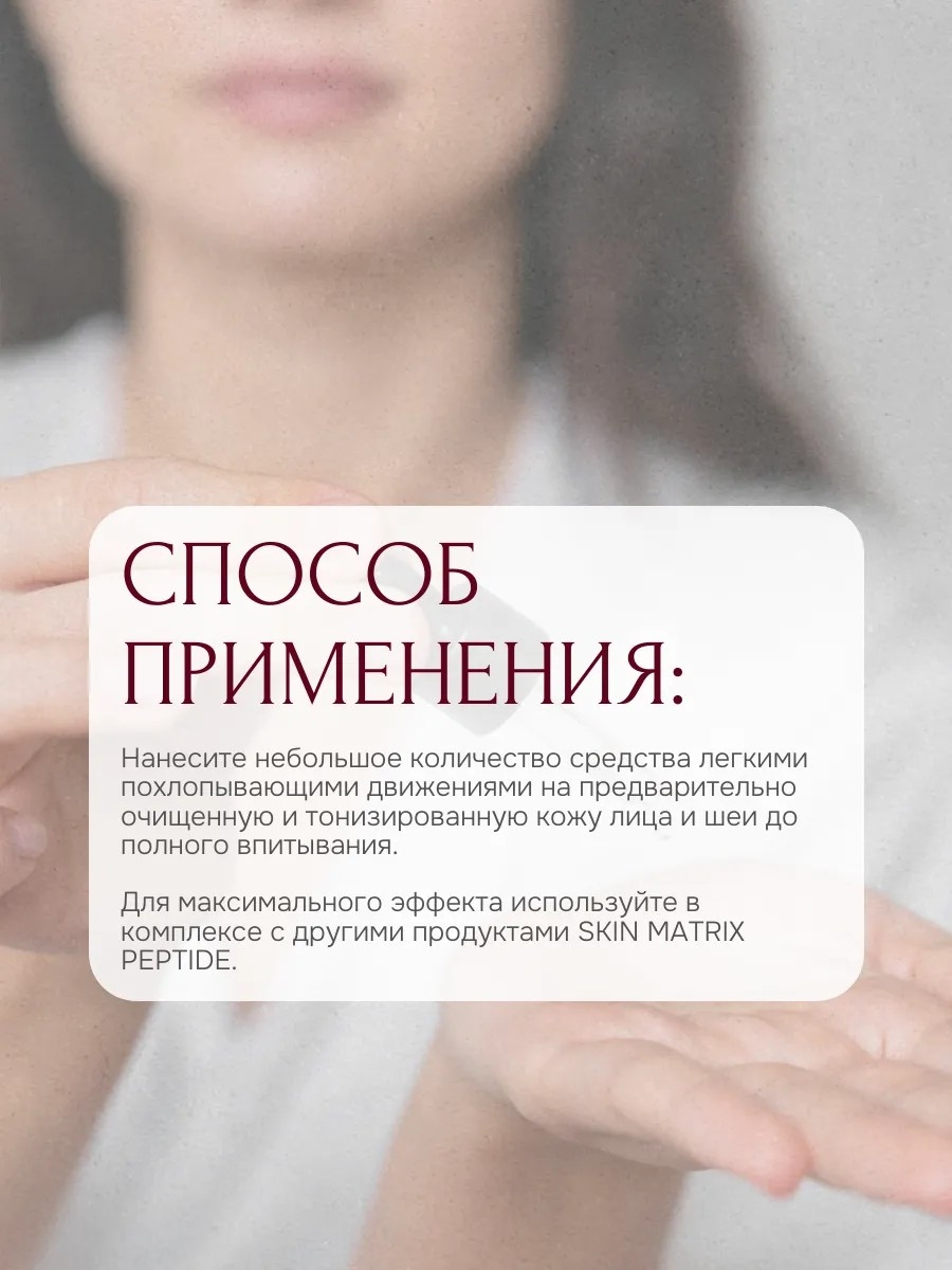 Нанесите средство на предварительно очищенную и тонизированную кожу лица и шеи. Мягкими движениями помассируйте до полного впитывания.Состав