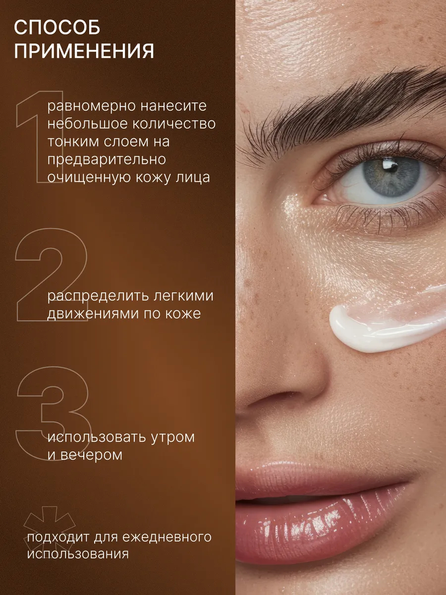 Равномерно нанесите небольшое количество тонким слоем на предварительно очищенную кожу лица. Не использовать после механического очищения лица или скрабов.Состав