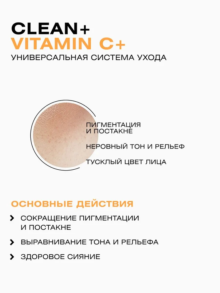 Благодаря витамину С в формуле отбеливающий крем для лица контролирует выработку пигмента меланина, осветляя пигментацию и постакне и предупреждая появление новых пигментных пятен. Также витамин С участвует в выработке коллагена, повышая упругость кожи. Крем для жирной кожи лица с витамином С работает как разглаживающий крем от морщин для лица. Крем для лица Clean+ эффективно борется с фотостарением – антивозрастной уход.