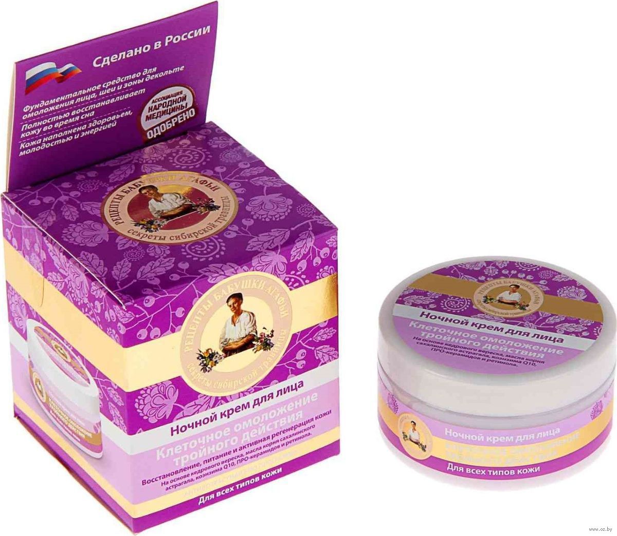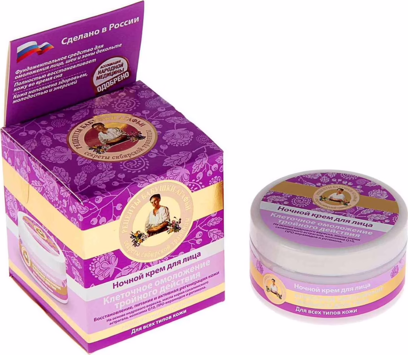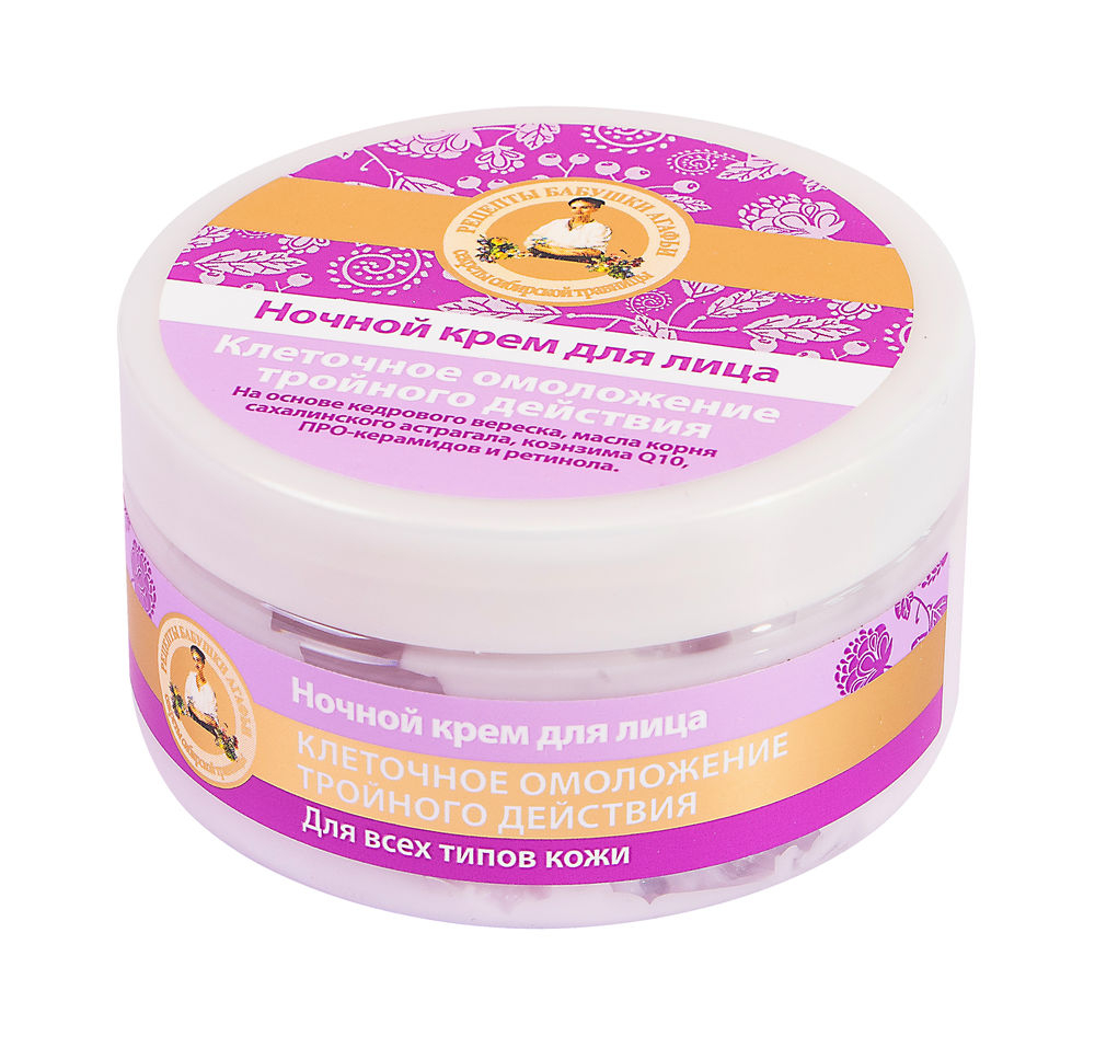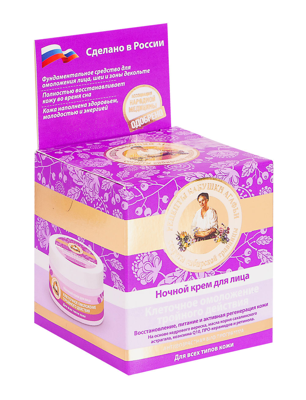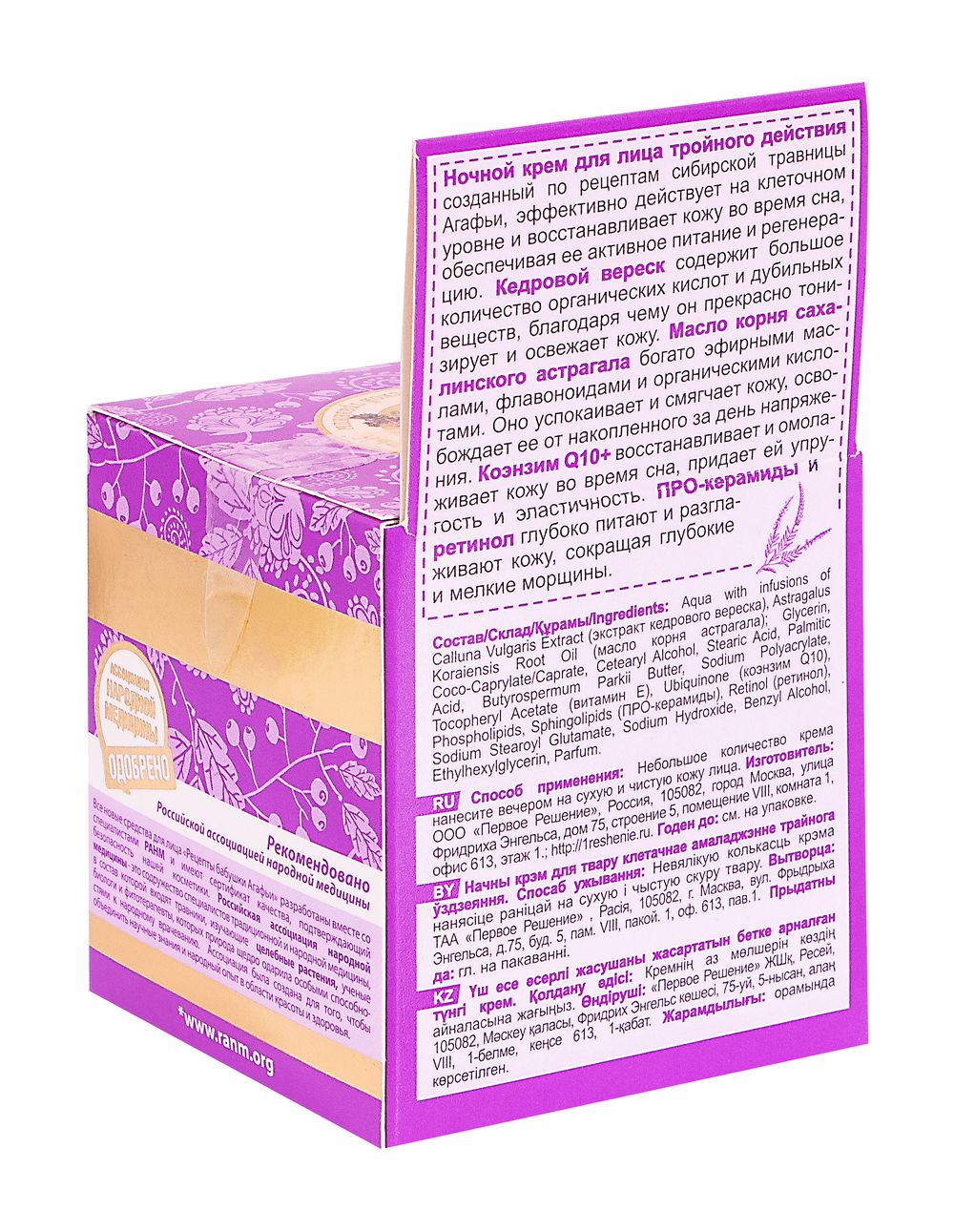 Ночной крем для лица тройного действия созданный по рецептам сибирской травницы Агафьи, эффективно действует на клеточном уровне и восстанавливает кожу во время сна, обеспечивая ее активное питание и регенерацию.
