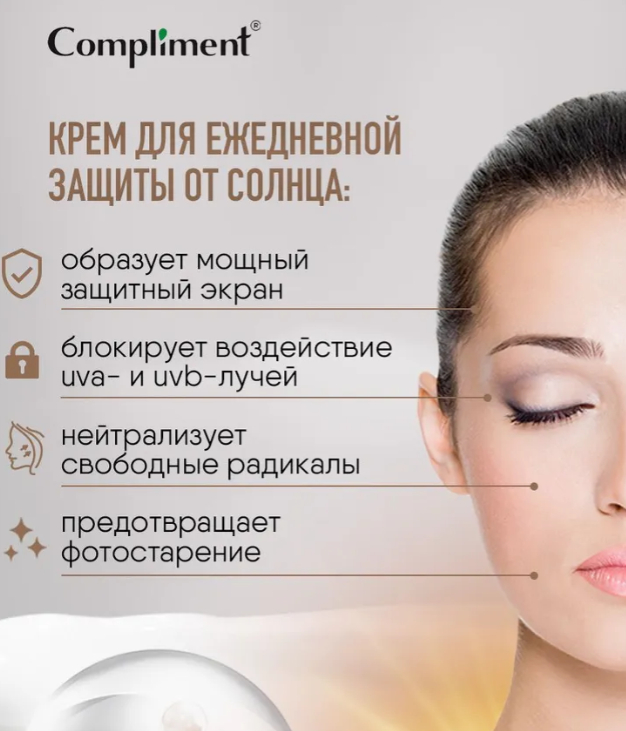 Солнцезащитный крем Compliment – это ваш надежный союзник в борьбе с вредным воздействием солнечных лучей.Формула с мощной комбинацией современных УФ-фильтров последнего поколения обеспечивает надежную защиту от UVA- и UVB-лучей, предотвращая фотостарение и сохраняя молодость вашей кожи.
