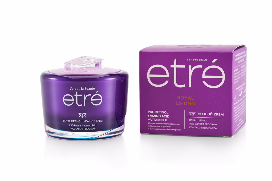 Крем для ночного ухода с Про-ретинол комплексом, аллантоином, ниацинамидом, обогащенный витамином F, наполняет кожу влагой, уменьшает выраженность морщин и повышает упругость кожи.