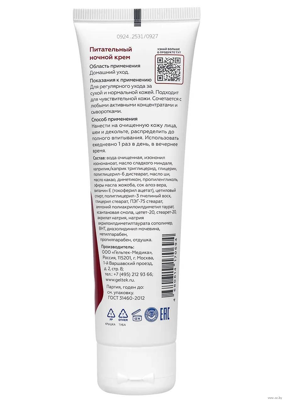 Нанести на очищенную кожу лица, шеи и декольте, распределить до полного впитывания. Использовать ежедневно после вечернего умывания и тонизации.Состав