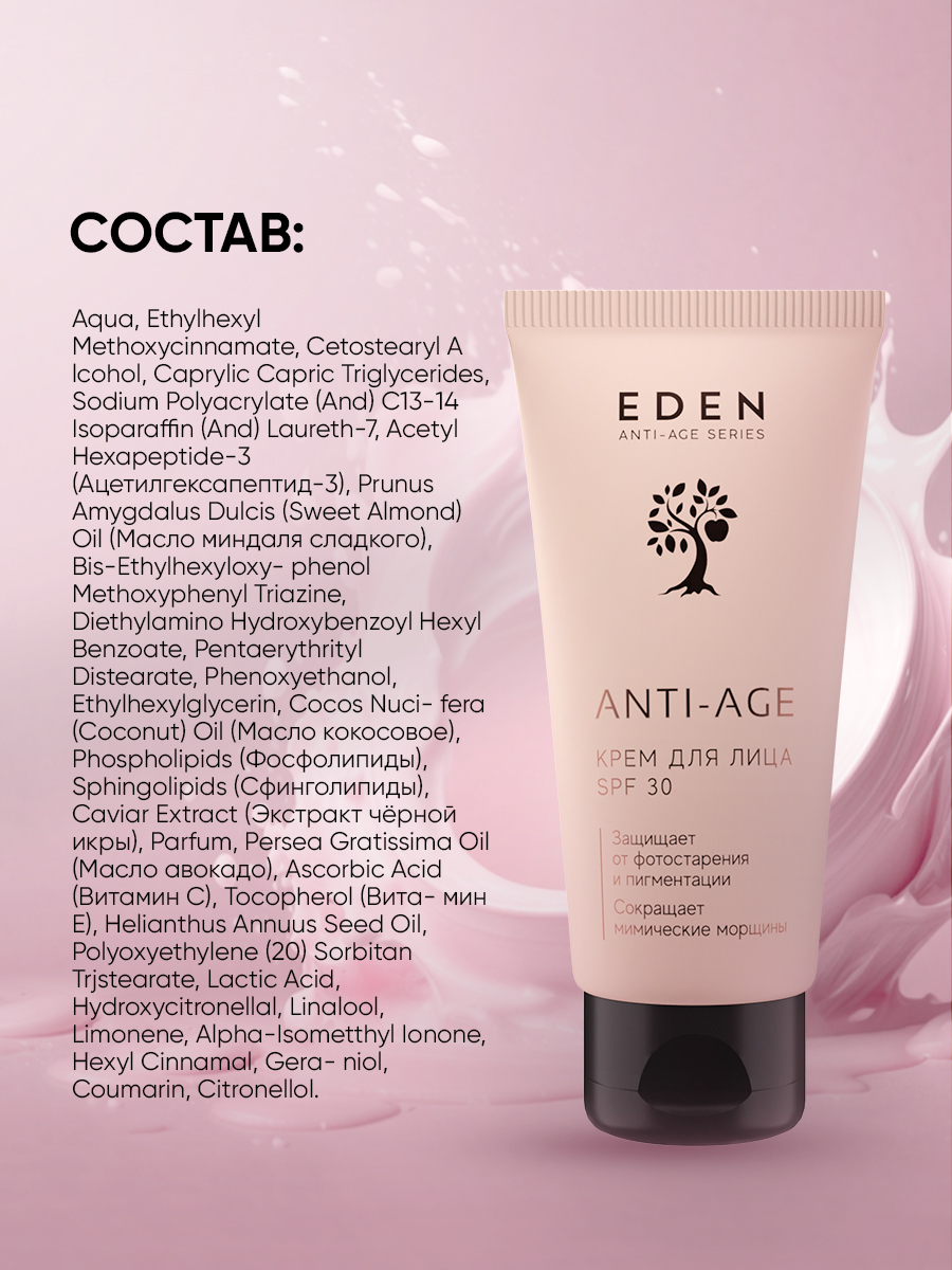 Дневной крем для лица Anti-Age СПФ 30 защищает кожу лица от неблагоприятного воздействия солнечных лучей, предотвращает появление пигментации. За счёт компонентов, восстанавливающих структуру кожи, обладает антивозрастным эффектом, придавая коже упругость и сияние.