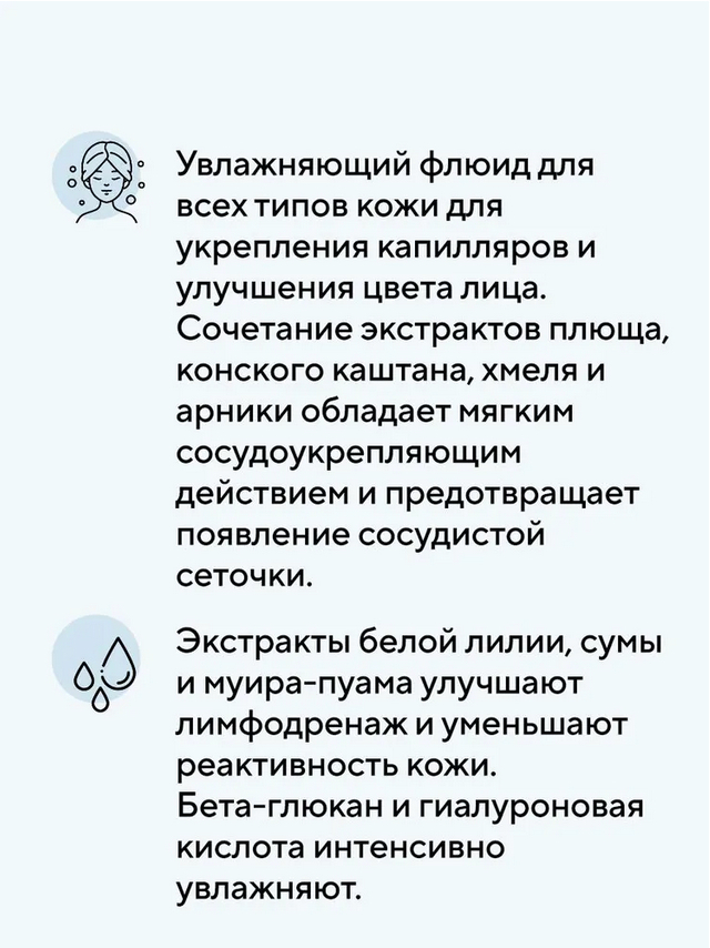 Сочетание экстрактов плюща, конского каштана, хмеля и арники обладает мягким сосудоукрепляющим действием и предотвращает появление сосудистой сеточки. Экстракты белой лилии, сумы и муира-пуама улучшают лимфодренаж и уменьшают реактивность кожи. Бета-глюкан и гиалуроновая кислота интенсивно увлажняют.