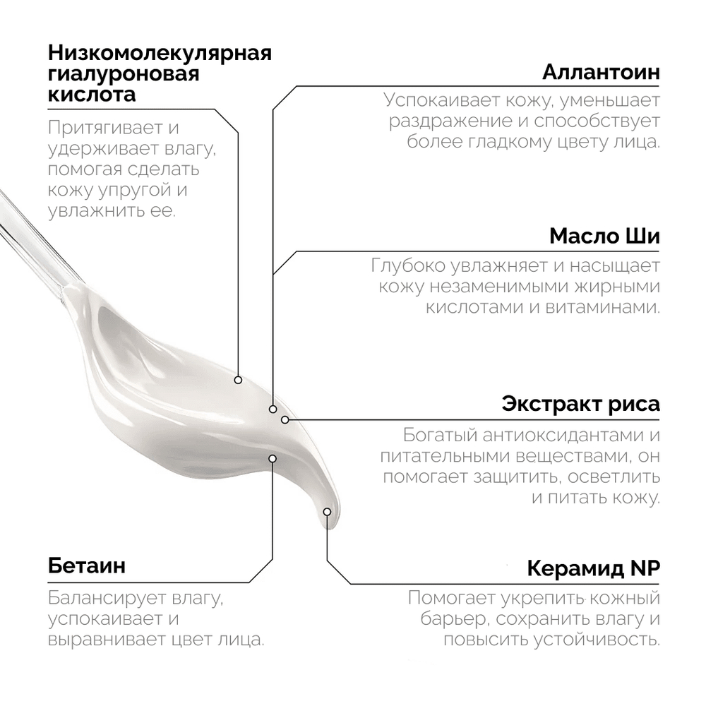 Water/ Aqua, Cetearyl Alcohol, Shea Butter/Butyrospermum Parkii Butter, Caprylic Capric/ Triglyceride, Sodium Hyaluronate, Butylene Glycol, Rice Extract/ Oryza Sativa Bran Extract, Glyceryl Stearate SE, Ceteareth-20, Dimethicone, Glycerin, Betaine, Ceramide III/Ceramide NP, Inulin, Alpha-Glucan Oligosaccharide, Vitamin C/Sоdium Ascorbyl Phosphate, Phenoxyethanol, Maltodextrin, Lactobacillus Ferment, Squalane, Sodium Polyacrylate, Fragrance/ Parfum, Allantoin, Disodium EDTA, Butylated Hydroxytoluene/ BHT.