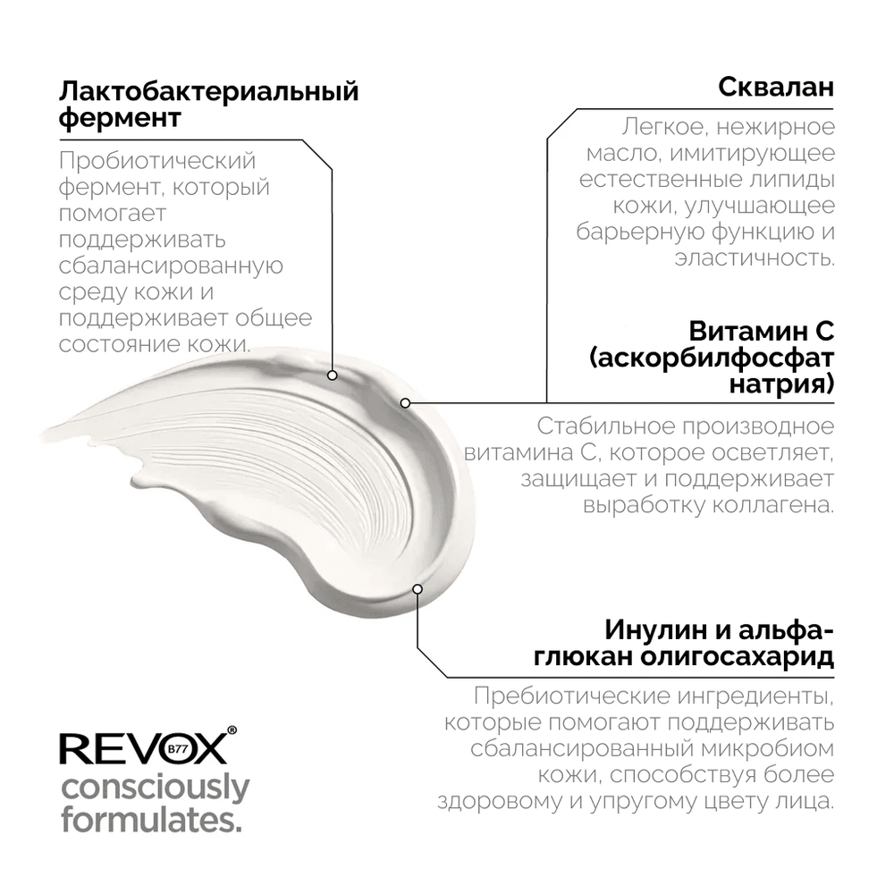 Пробиотики помогают поддерживать естественный баланс и здоровье кожи. Гиалуроновая кислота удерживает влагу в коже, сохраняя её упругость, а витамин С обладает осветляющими свойствами и освежает кожу. Продукт насыщает кожу питательными веществами, помогая разгладить мелкие морщинки и подтянуть дряблую кожу.