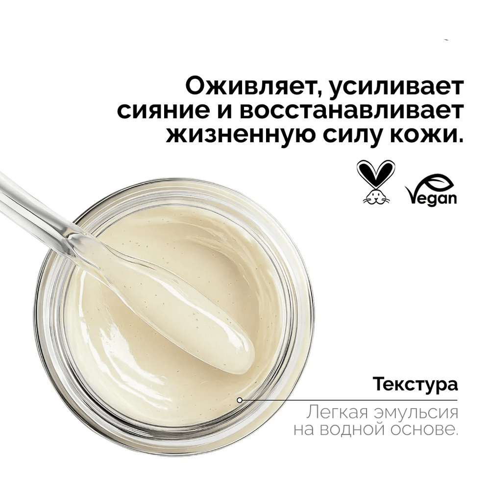Эта кремовая и быстро впитывающаяся формула тает на коже, насыщая её активными ингредиентами, которые действуют в синергии, осветляя и восстанавливая тусклую и уставшую кожу. Витамин С – мощный антиоксидант, который защищает кожу от свободных радикалов, освежая и тонизируя её.