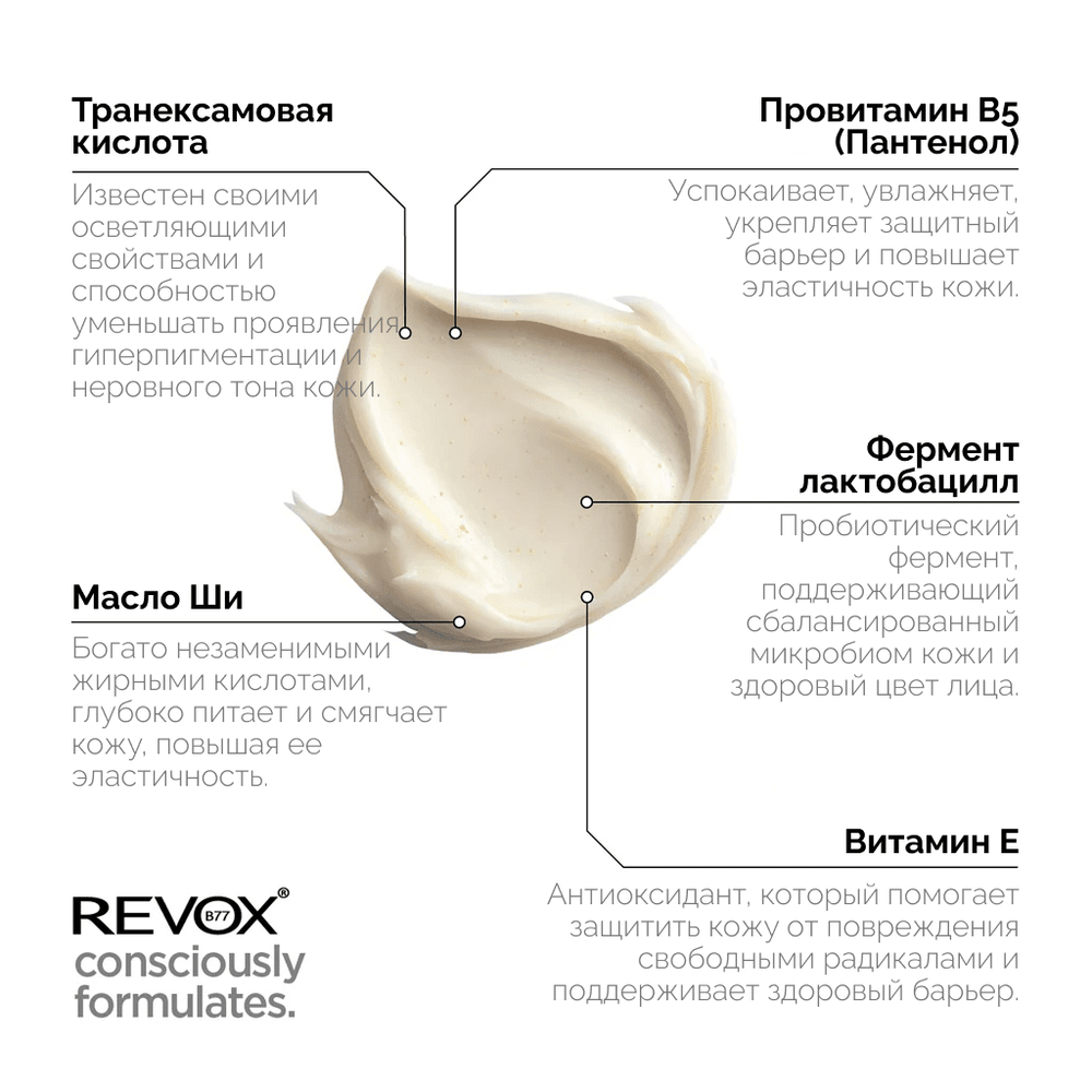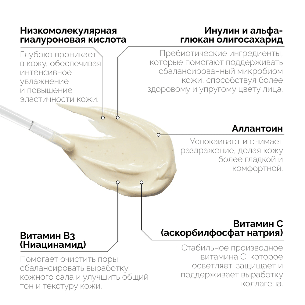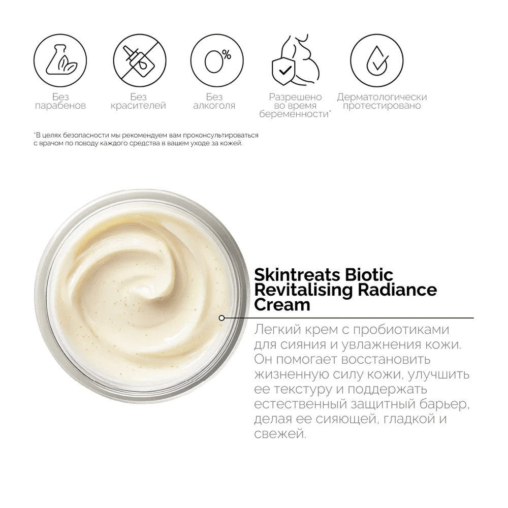 Пробиотики поддерживают естественный баланс и здоровье кожи. Гиалуроновая кислота помогает удерживать влагу в коже, сохраняя её упругость. Этот крем выравнивает тон кожи, придавая ей сияние и здоровье.