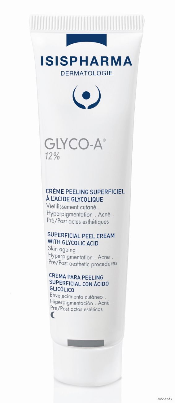 Поверхностный отшелушивающий крем с гликолевой кислотой 12%. Показания к использованию: излишняя выработка себума, первые признаки старения, пигментные пятна.