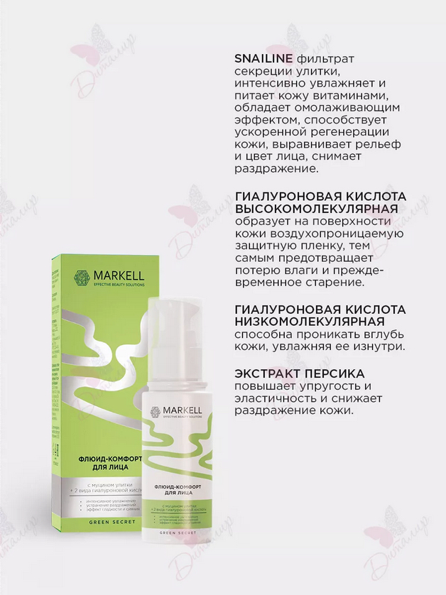 Активные компоненты в составе флюида активно увлажняют и питают клетки кожи, повышают их эластичность и упругость, продлевая молодость и наполняя кожу здоровым естественным сиянием.