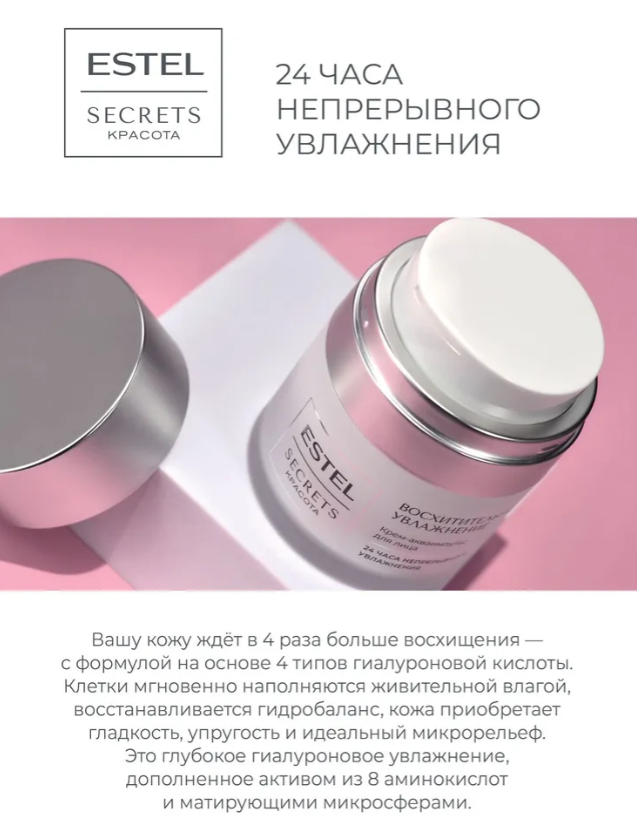 Крем-акваимпульс для лица "Восхитительное увлажнение" дарит 24 часа непрерывного увлажнения. Клетки мгновенно наполняются живительной влагой, восстанавливается гидробаланс, кожа приобретает гладкость, упругость и идеальный микрорельеф. Это глубокое гиалуроновое увлажнение, дополненное активом из 8 аминокислот и матирующими микросферами.