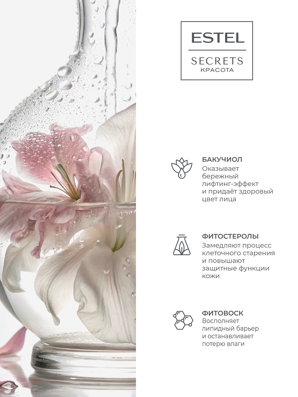 Кожа готова к новому дню. Ночью, когда клетки замедляют работу, активируются натуральные фитостеролы: укрепляют, повышают барьерные функции, замедляют разрушительные процессы и восстанавливают кожу на мембранном уровне. Доводя результат до идеала, фитовоск сохраняет увлажнённость, а бакучиол обеспечивает мягкий лифтинг.