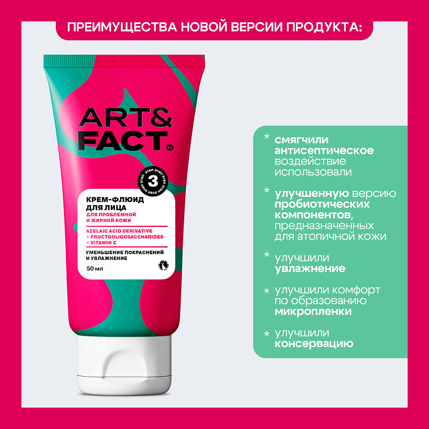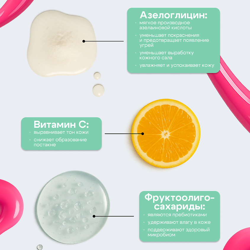 Витамин С придает лицу свежий цвет и сокращает постакне. Фруктоолигосахариды способствуют удержанию влаги в коже и поддерживают здоровый микробиом благодаря своим пребиотическим свойствам. Таким образом, крем-флюид позволяет наладить базовый уход за подростковой кожей, в том числе при склонности к высыпаниям.