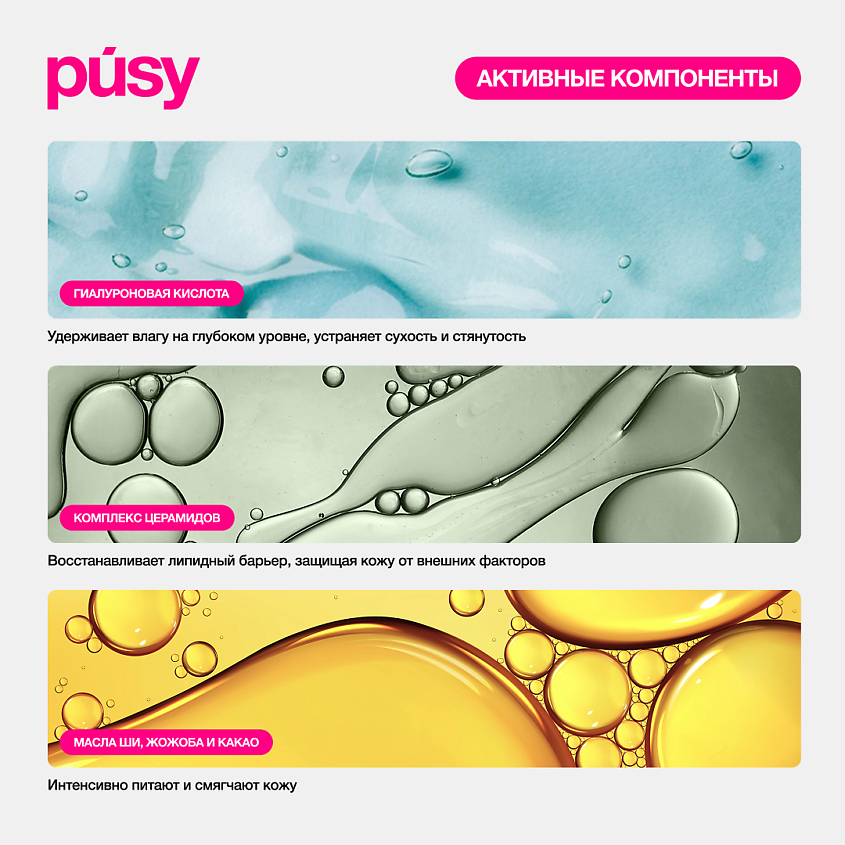 | Активные компоненты | Гиалуроновая кислота, комплекс масел, церамиды (керамиды) |