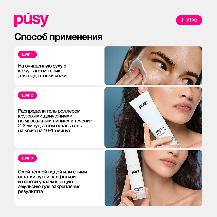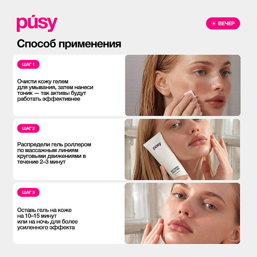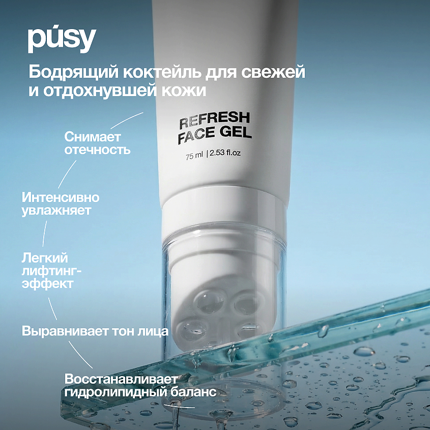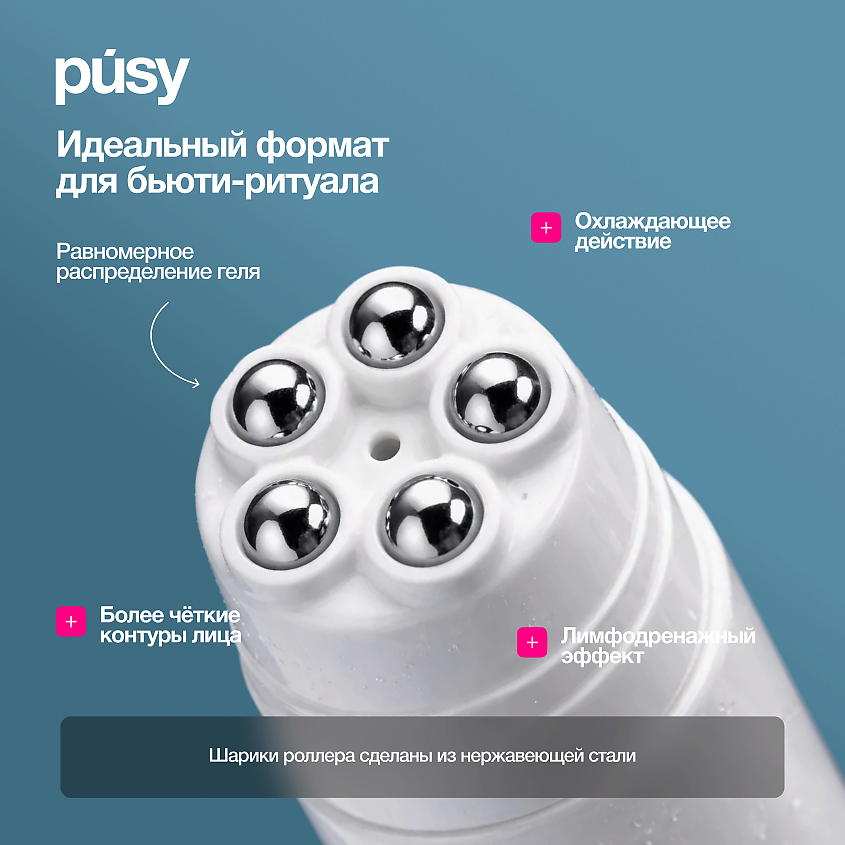 Формула создана для борьбы с отеками, признаками усталости и тусклого цвета лица, особенно после пробуждения. Гель эффективно тонизирует и придаёт коже бодрый, отдохнувший вид, а массажный роллер равномерно распределяет и усиливает его эффект.