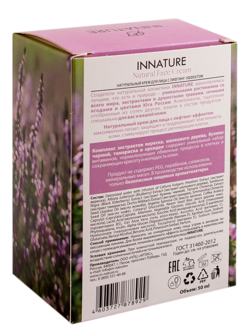 Натуральный крем для лица с лифтинг-эффектом максимально питает, защищает и поддерживает эластичность кожи, стимулирует процесс регенерации клеток.