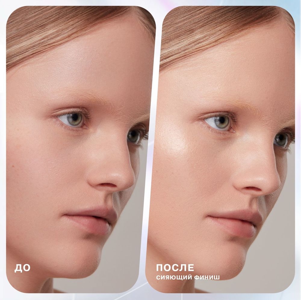 Мельчайшие сияющие частицы хайлайтера разных размеров и оттенков создают на коже равномерное деликатное сияние, завораживающие переливы которого притягивают и манят.