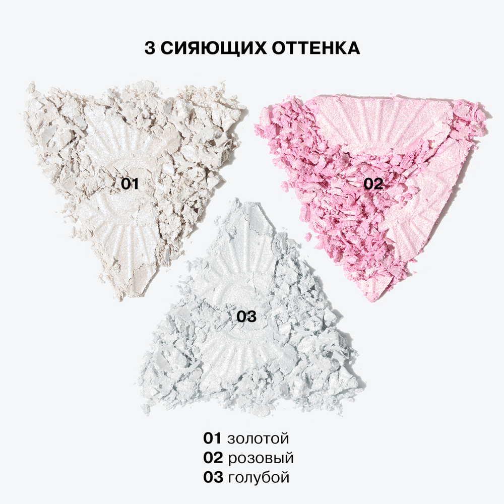 Самый трендовый финиш в макияже! Комбинация крупных глиттеров и мелких сияющих частиц хайлайтера создает эффект влажной кожи, наполненной космическим сиянием звезд.