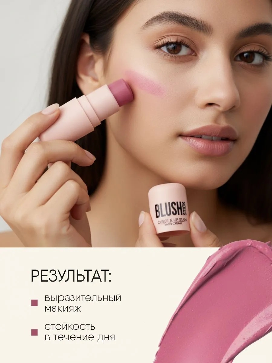 Универсальность: стик подходит для использования в качестве румян на щеках, а также в качестве помады для губ, что делает его дополнительным аксессуаром для макияжа "на бегу".