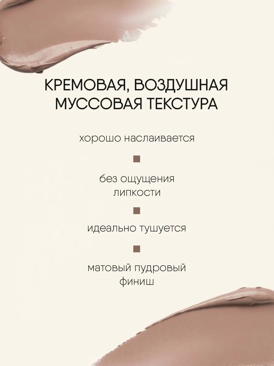 Нежная текстура воздушной мусса: легко наносится и идеально растушёвывается, придавая коже свежесть и нежное сияние.