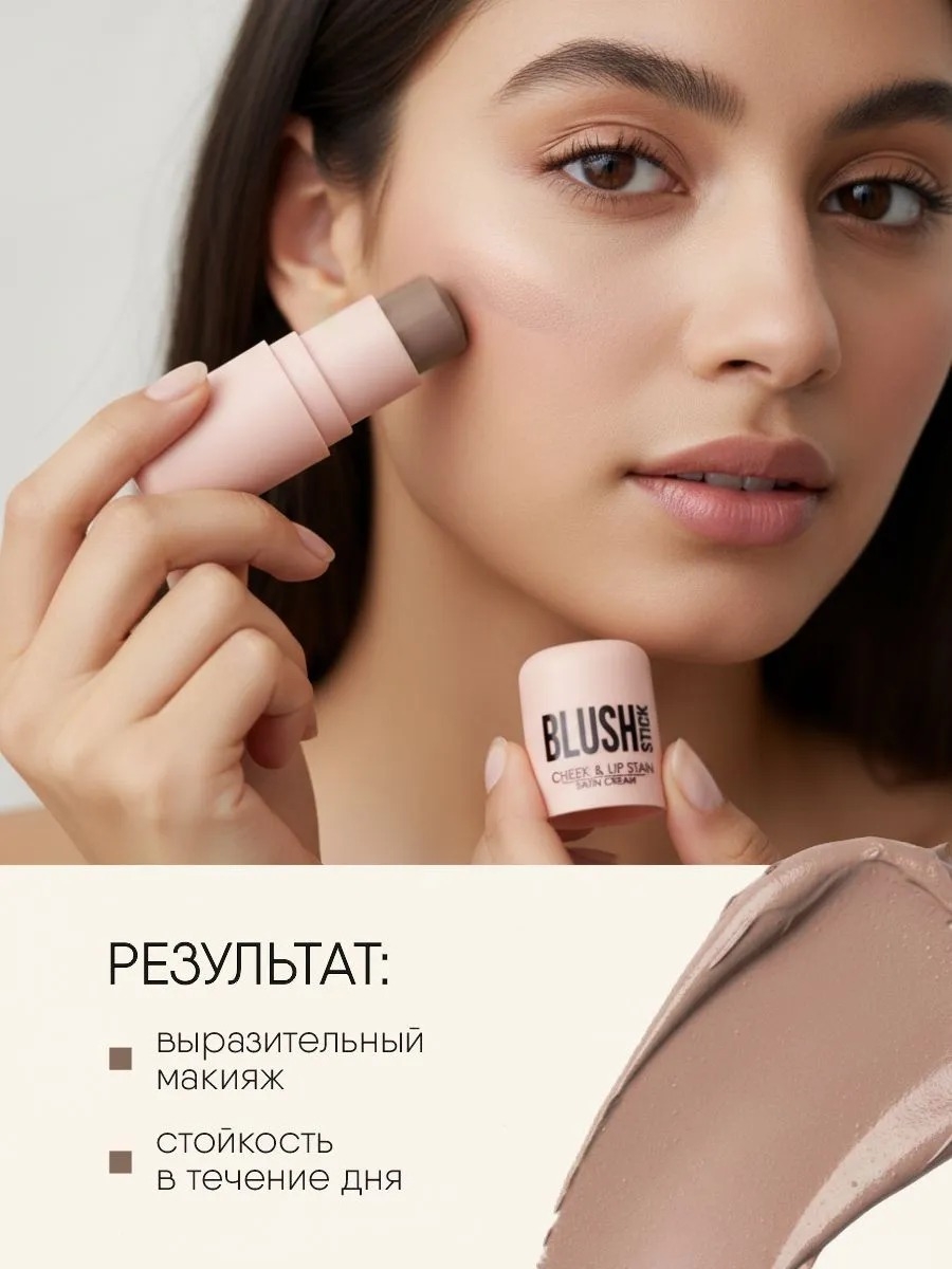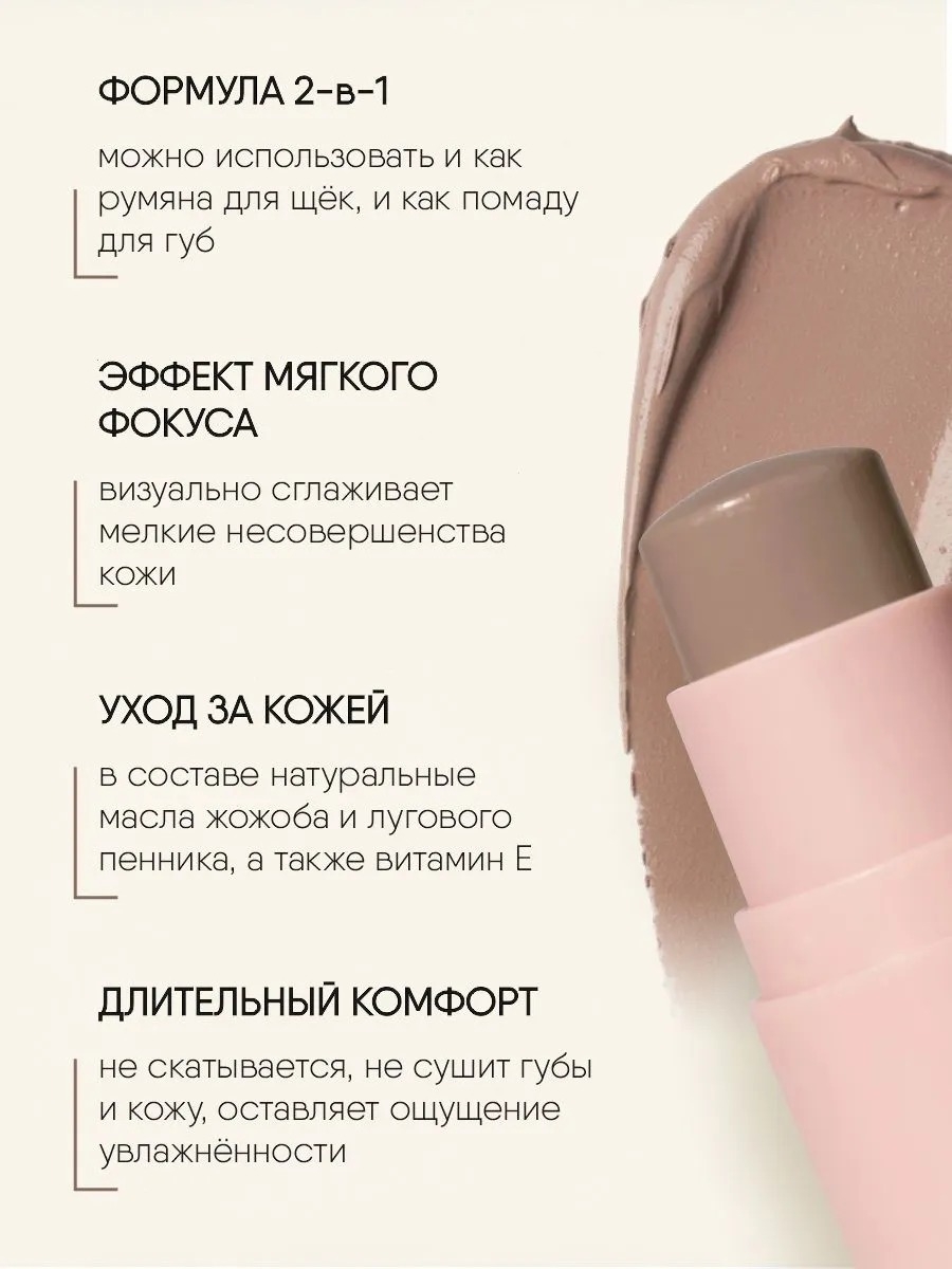 Универсальность: стик подходит для использования в качестве румян на щеках, а также в качестве помады для губ, что делает его дополнительным аксессуаром для макияжа "на бегу".