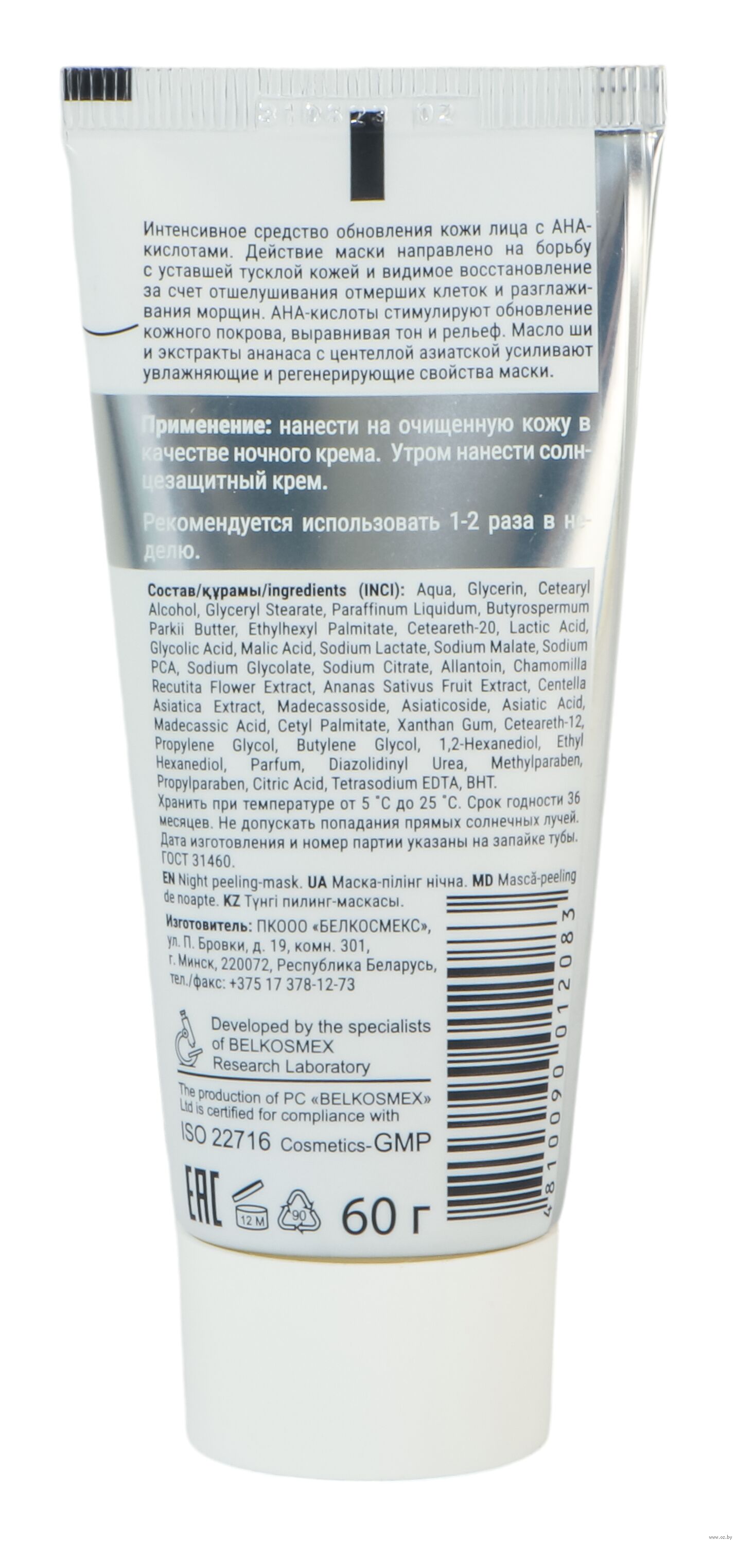 Интенсивное средство обновления кожи лица с AHA-кислотами. Действие маски направлено на борьбу с уставшей тусклой кожей и видимое восстановление за счет отшелушивания отмерших клеток и разглаживания морщин.