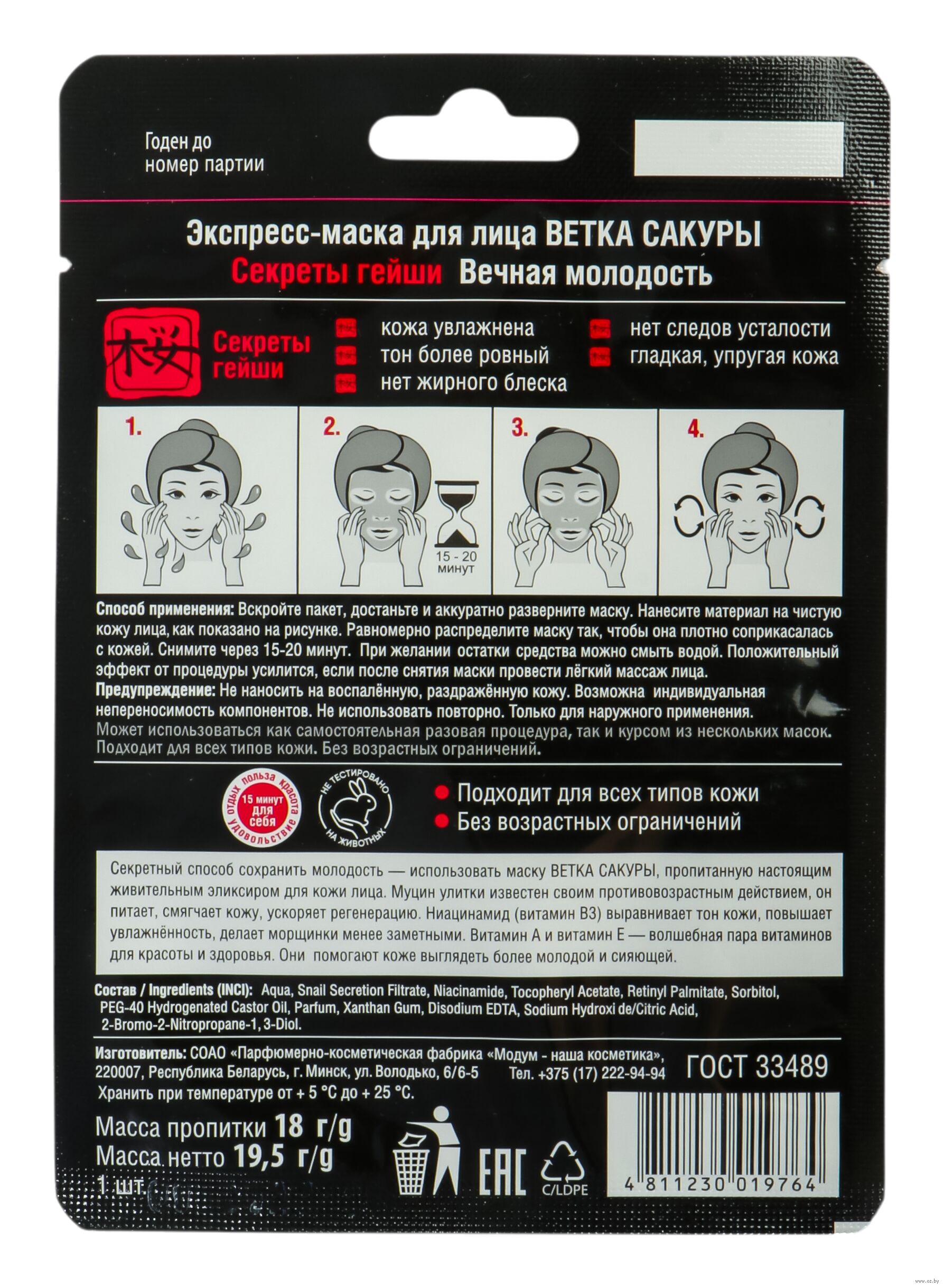 Секретный способ сохранить молодость – использовать маску, пропитанную настоящим живительным эликсиром для кожи лица. Муцин улитки известен своим противовозрастным действием, он питает, смягчает кожу, ускоряет регенерацию. Ниацинамид (витамин В3) выравнивает тон кожи, повышает увлажнённость, делает морщинки менее заметными. Витамин А и витамин Е – волшебная пара витаминов для красоты и здоровья. Они помогают коже выглядеть более молодой и сияющей.