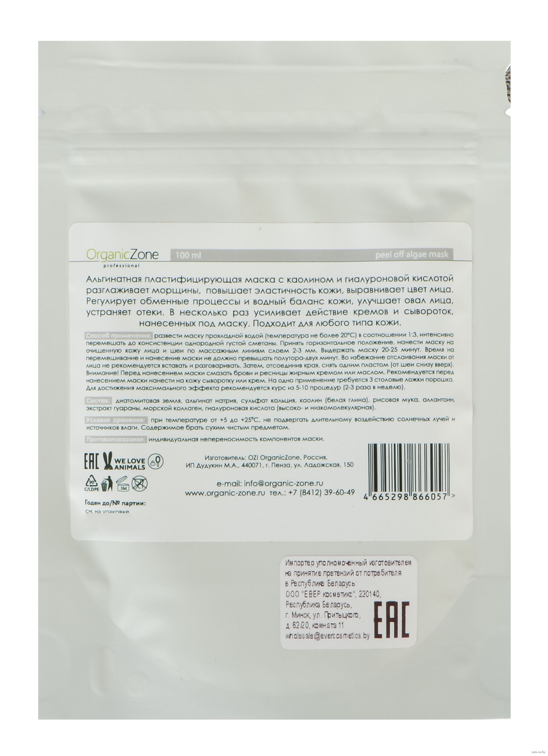 Развести маску прохладной водой (не более 20 ᵒС) в соотношении 1:3 (на 1 столовую ложку маски – 3 столовые ложки воды) интенсивно перемешать до консистенции однородной густой сметаны. Принять горизонтальное положение, нанести маску на очищенную кожу лица и шеи слоем 2-3 мм. Выдержать 20-25 минут. Затем, отсоединив края, снять одним пластом (от шеи снизу вверх).Состав