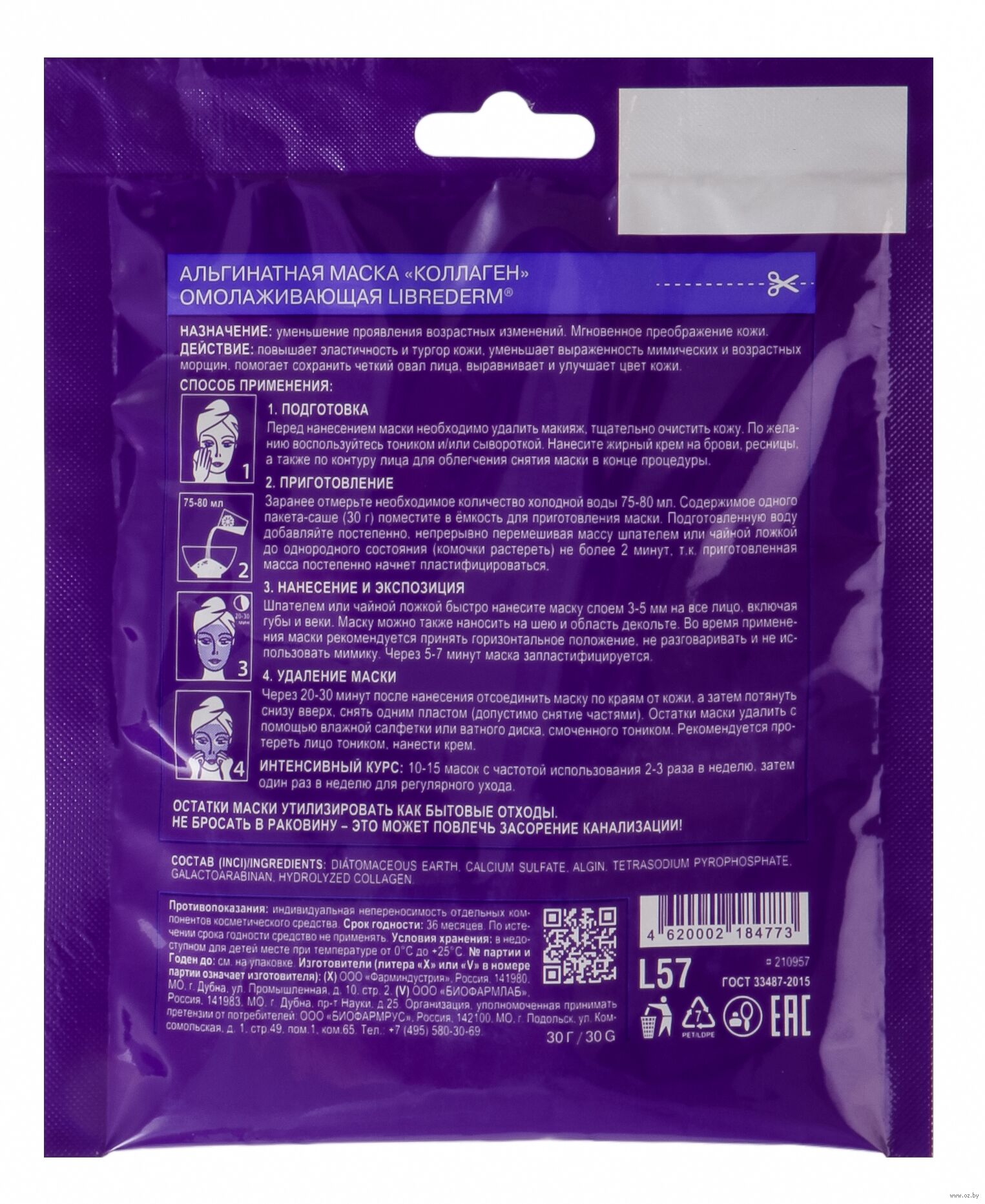 Наносите маску на хорошо очищенную кожу. Смешайте содержимое одного пакета-саше с 75 мл (7-8 ст. л.) холодной воды. Тщательно перемешайте до получения консистенции густой сметаны. Наносите маску толстым слоем (3-5 мм) на лицо, губы и веки с помощью шпателя или чайной ложки. Предварительно смажьте брови и ресницы жирным кремом. Через 25-30 минут отсоедините маску по краям от кожи (можно использовать воду или тоник), а затем одним движением снизу вверх снимите её. Остатки можно убрать с помощью влажных салфеток. Рекомендуется протереть кожу тоником Librederm. Применяйте маску каждый день в течение 10-15 дней, а затем 1-2 раза в неделю.Состав