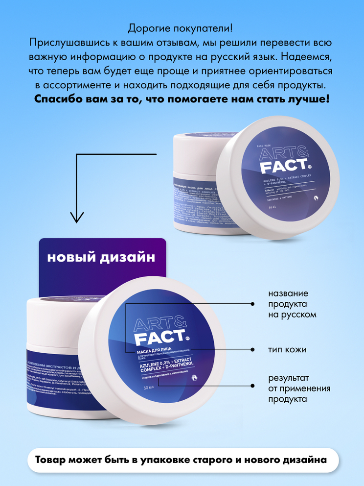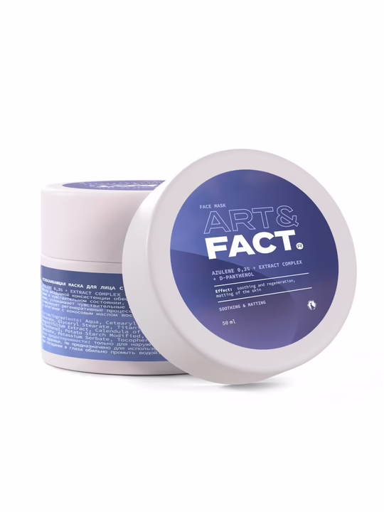 Успокаивающая маска для лица с азуленом 0,3%, комплексом экстрактов и Д-пантенолом.