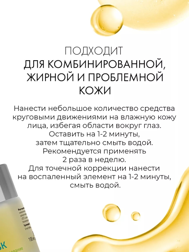 Нанести небольшое количество средства круговыми движениями на влажную кожу лица, избегая области вокруг глаз. Оставить на 1-2 минуты, затем тщательно смыть водой. Рекомендуется применять 2 раза в неделю. Для точечной коррекции нанести на воспаленный элемент на 1-2 минуты, смыть водой.Состав