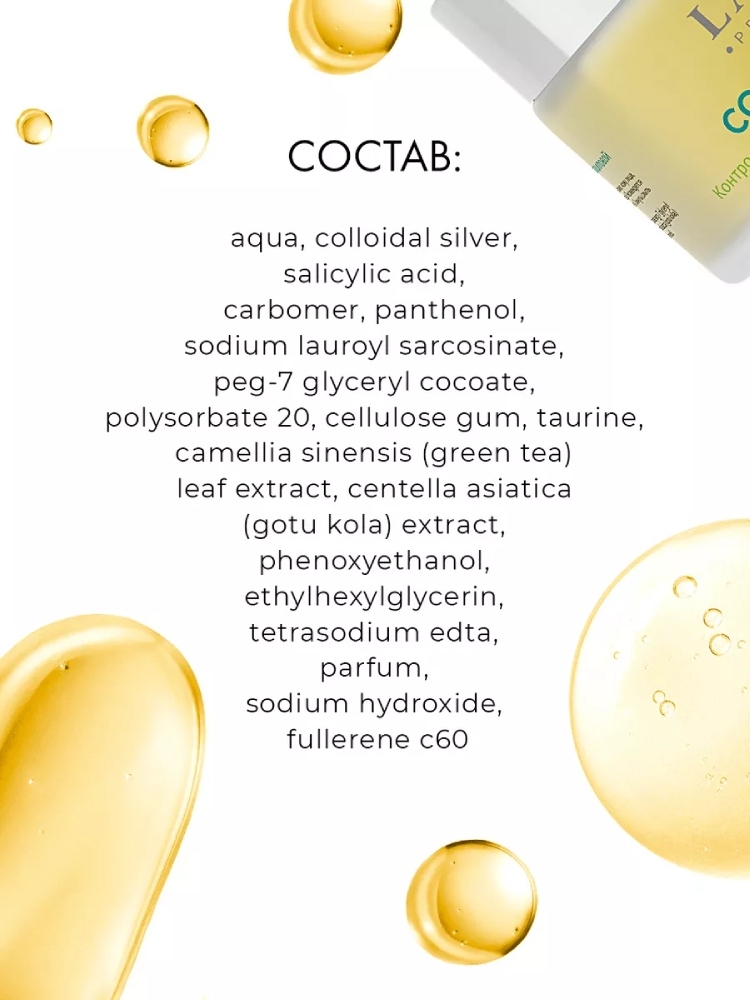 Аqua, colloidal silver, salicylic acid, carbomer, panthenol, sodium lauroyl sarcosinate, peg-7 glyceryl cocoate, polysorbate 20, cellulose gum, taurine, camellia sinensis (green tea) leaf extract, centella asiatica (gotu kola) extract, phenoxyethanol, ethylhexylglycerin, tetrasodium edta, parfum, sodium hydroxide, fullerene c60.
