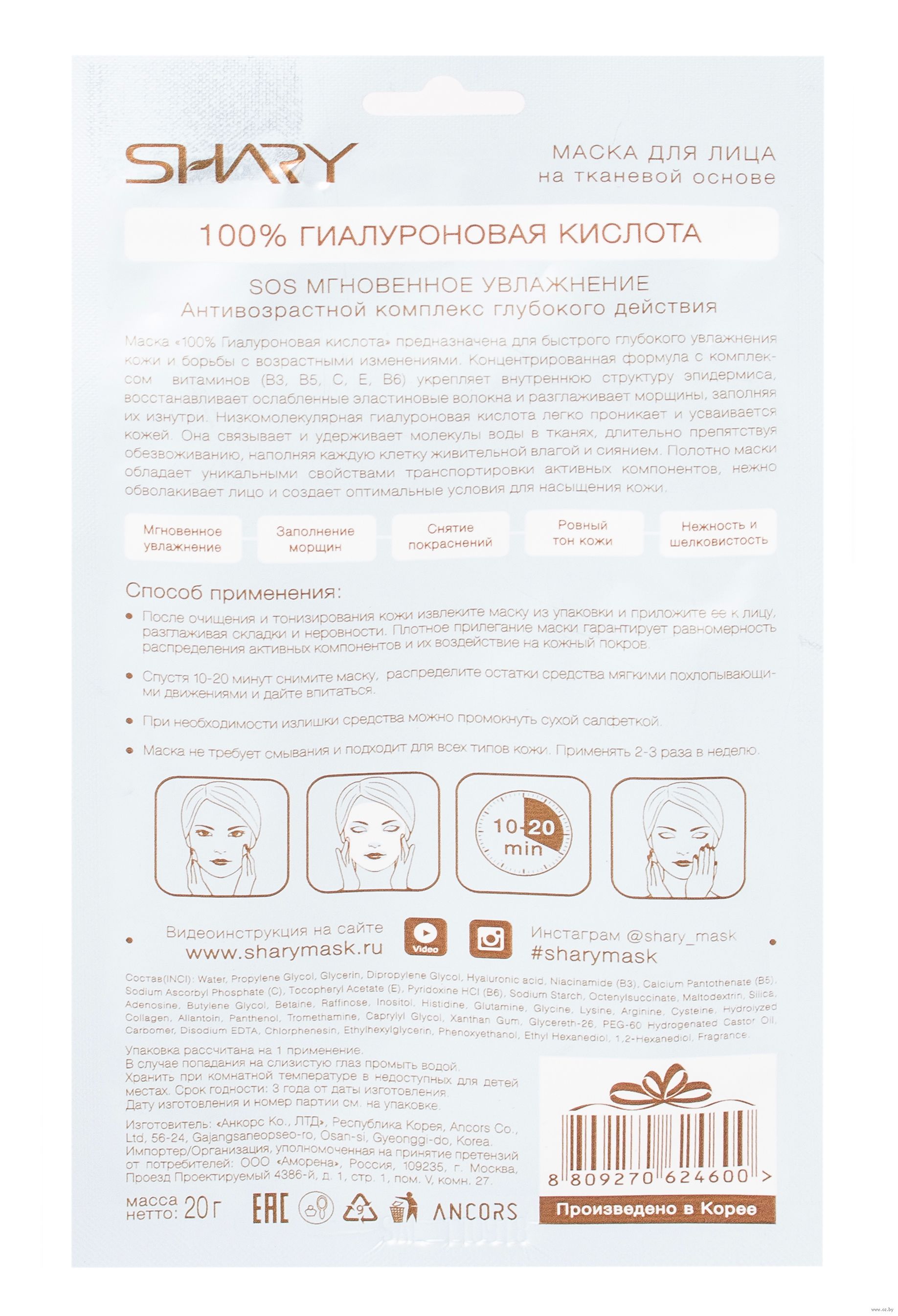 Тканевая маска для лица "100% гиалуроновая кислота" (20 г)