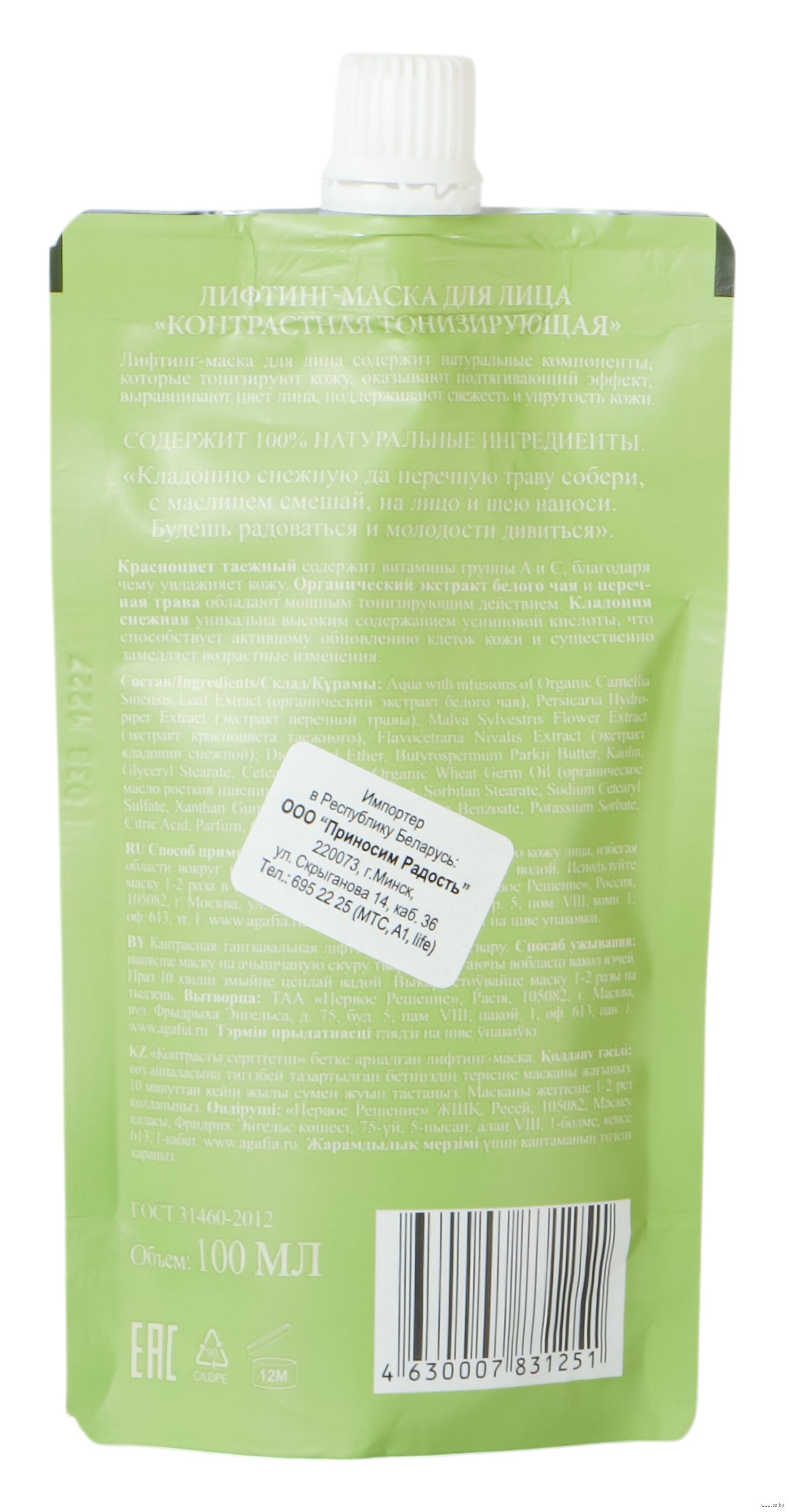 Aqua, Dicaprylyl Ether, Butirospermum Parkii (Shea Butter), Organic Camellia Sinensis Leaf Extract (органический экстракт белого чая), Persicaria Hydropiper Extract (экстракт перечной травы), Malva Sylvestris Extract (экстракт красноцвета таежного), Citraria Nivalis Extract (экстракт кладонии снежной), Kaolin, Glyceryl Stearate, Organic Triticum Vulgare (Wheat) Germ Oil (органическое масло ростков пшеницы), Cetearyl Alcohol, Sorbitane Stearate, Sodium Cetearyl Sulfate, Xanthan Gum, Potasium Sorbate, Parfum, Citric Acid.