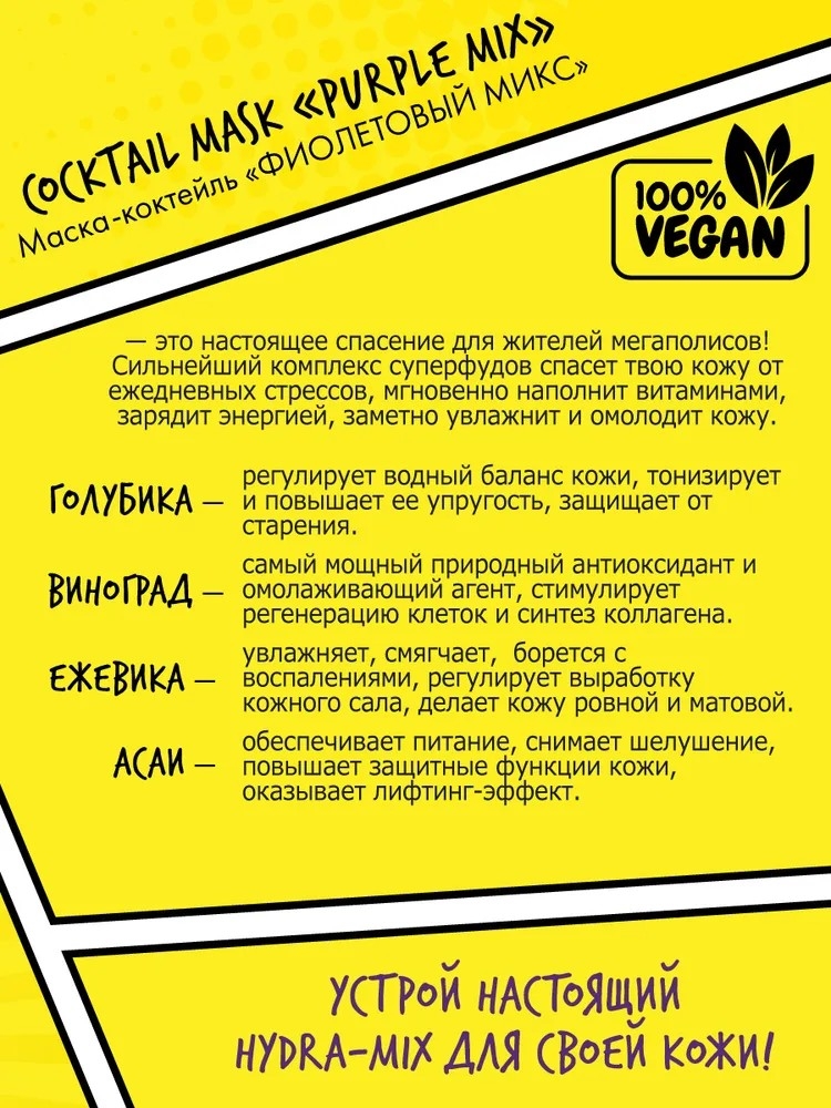 Маска-коктейль – это настоящее спасение для жителей мегаполисов! Сильнейший комплекс суперфудов спасет твою кожу от ежедневных стрессов, мгновенно наполнит витаминами, зарядит энергией, заметно увлажнит и омолодит кожу.