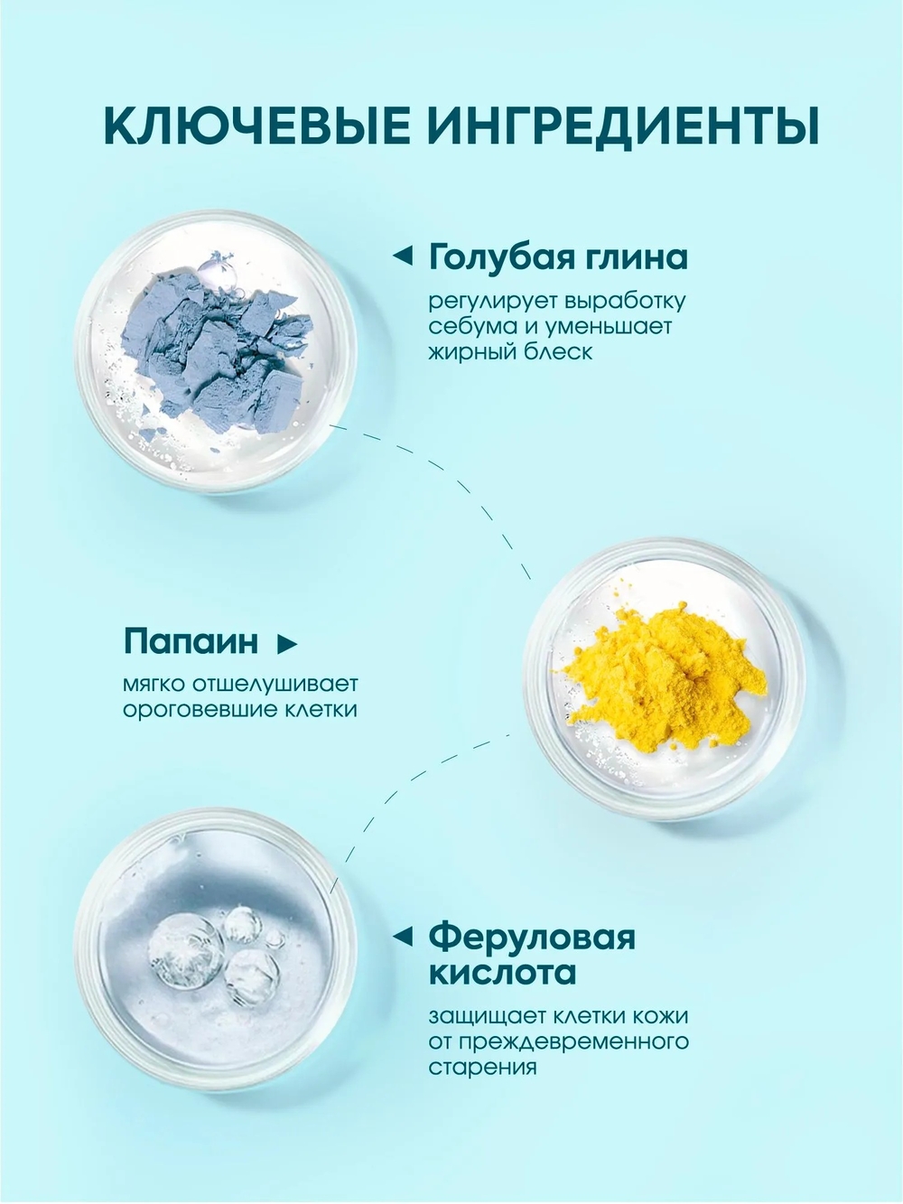 Голубая глина регулирует выработку себума и уменьшает жирный блеск. Папаин мягко отшелушивает ороговевшие клетки, а феруловая кислота осветляет пигментные пятна. Полифенолы куркумы защищают клетки кожи от преждевременного старения.