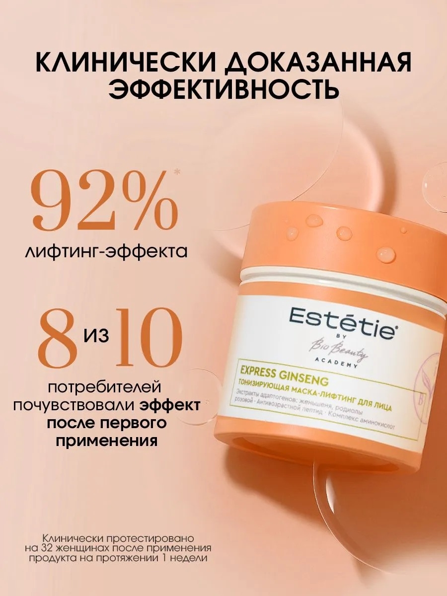 Маска-лифтинг разработана на основе уникальных свойств природных адаптогенов – женьшеня и родиолы розовой. Они тонизируют кожу и возвращают ей плотность, разглаживая сетку мелких морщин.