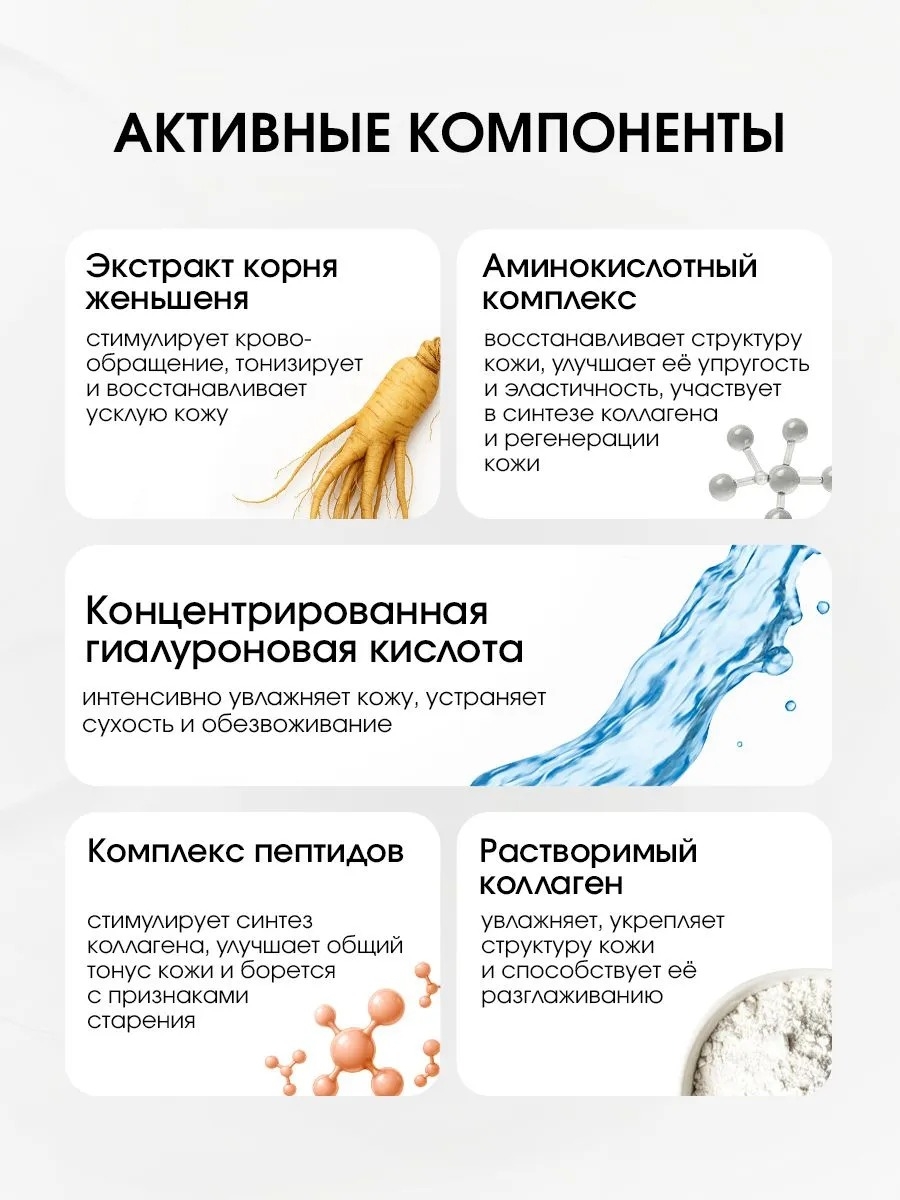 Антивозрастной пептид нового поколения увеличивает плотность межклеточного матрикса и восстанавливает упругость кожи. Биоцевтические экстракты адаптогенов активизируют защитные механизмы, замедляя процесс старения, а комплекс аминокислот восполняет ресурсы молодости кожи.