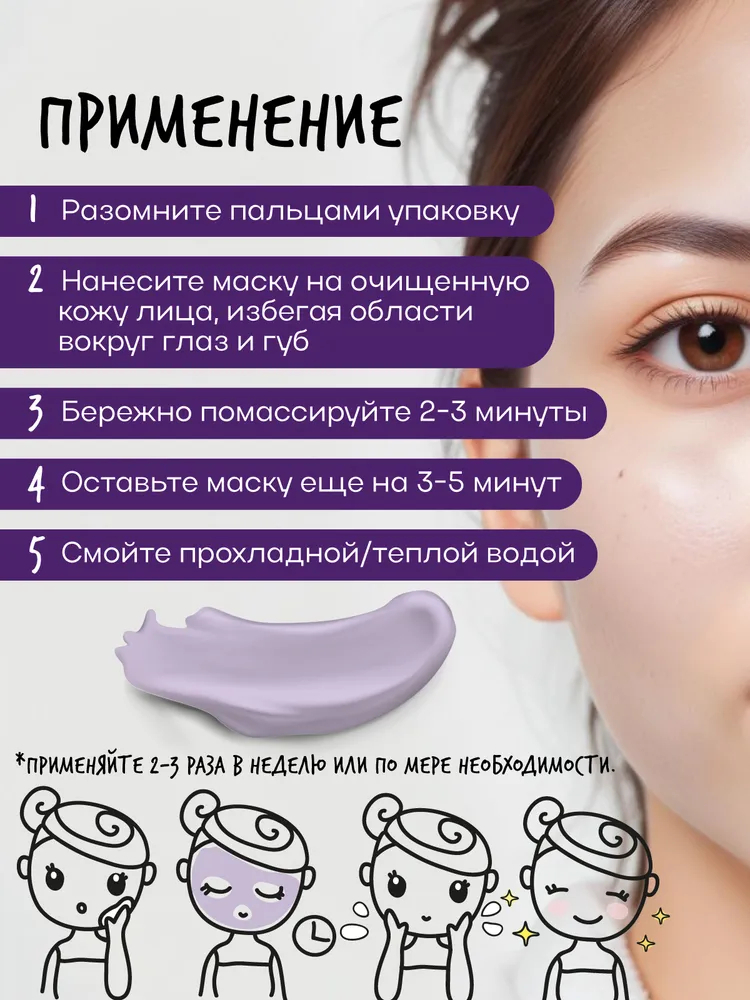 Разомните пальцами упаковку. Нанесите маску на очищенную кожу лица, избегая области вокруг глаз и губ. Бережно помассируйте 2-3 минуты. Оставьте маску еще на 3 -5 минут, смойте прохладной/теплой водой.Состав