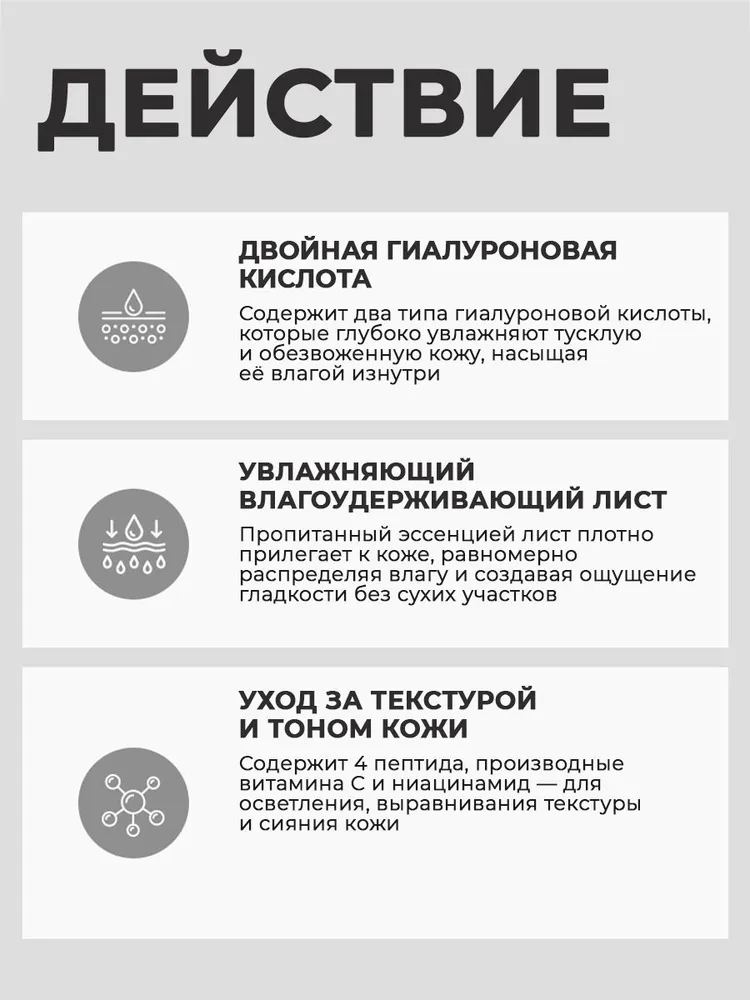 Тканевая маска с пептидами направлена на мягкое отбеливание и борьбу с пигментацией и пост-акне, выравнивает и осветляет тон кожи. Напитывает эпидермис витаминами и тонизирует, освежает общий цвет лица, а также возвращает коже естественное сияние. Комплекс гиалуроновой кислоты и пептидов проникает глубоко в клетки эпидермиса, интенсивно увлажняет, справляется с сухостью и шелушениями. Замедляет процессы старения, способствует разглаживанию морщин и укрепляет тургор кожи.