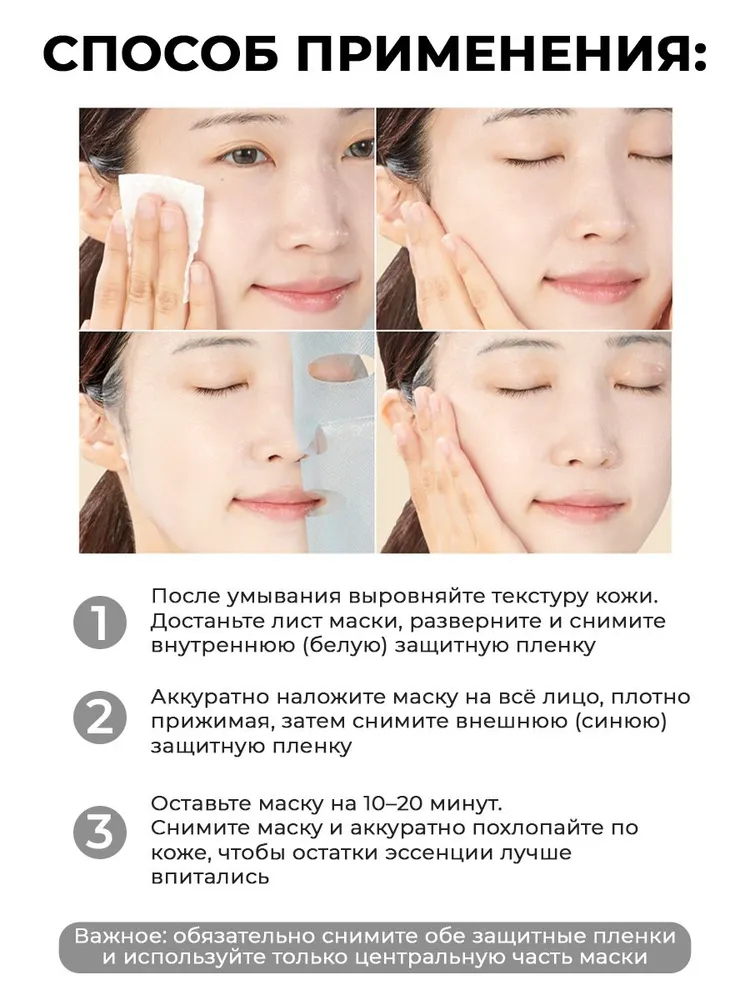 Извлеките маску из упаковки. Затем расположите маску на поверхности очищенной, тонизированной кожи и оставьте на 15-20 минут. Аккуратно снимите маску и легко помассируйте, чтобы увлажняющая сыворотка впиталась. Не требует смывания. Для достижения лучшего эффекта рекомендуется повторять процедуру 3 раза в неделю. При обнаружении чувствительности к компонентам прекратить использование. Маска предназначена для одноразового применения.Состав