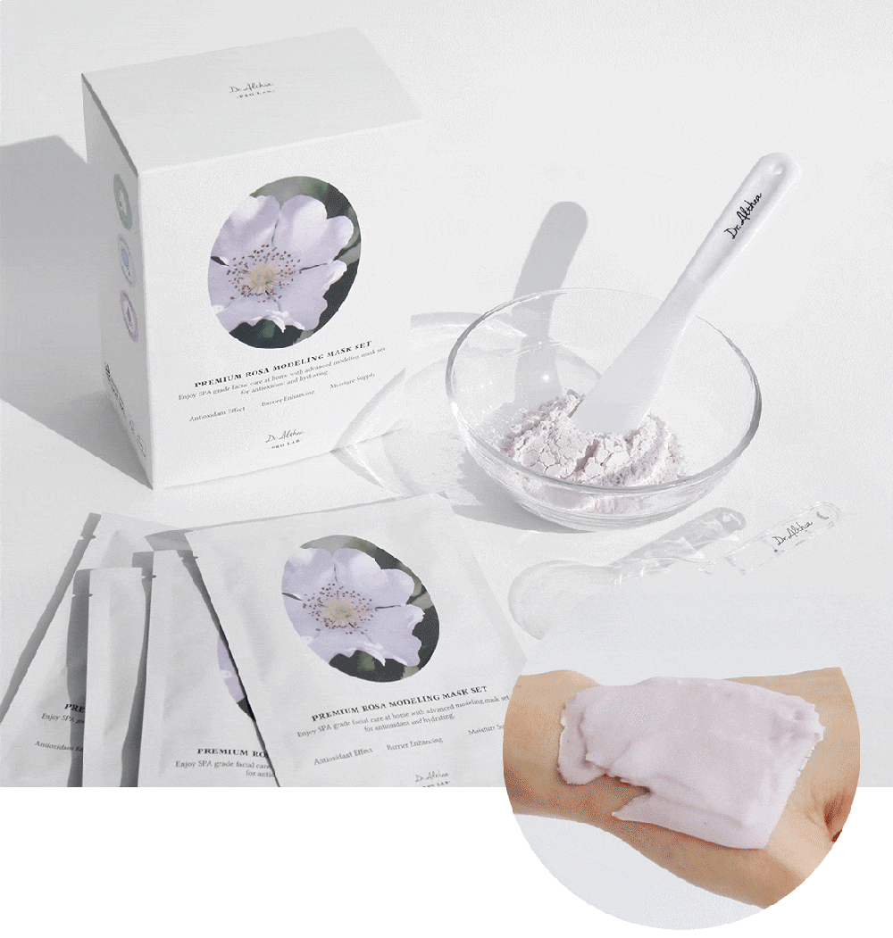 Альгинатная маска для лица Premium Rosa Modeling Mask Set. Premium Rosa Modeling Mask обеспечивает мягкий антиоксидантный уход, увлажнение и укрепление кожного барьера в простой в использовании домашней моделирующей маске.