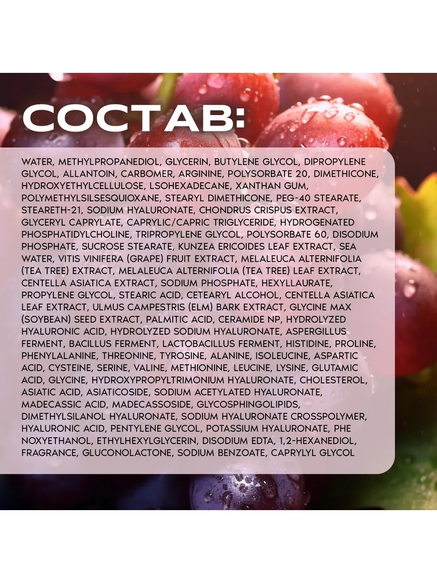 Water methylpropanediol, glycerin butylene glycom polymethylsilsesquioxanin carbomer, arginine polysorbate 20 dimethicone hydroxyethylcellulose isohexadecane xanthan gum, polyethylsil sesquioxane, stearyl dimethicone peg-40 stearate steareth-21 sodium hyaluronate, chondrus crispus extract, glyceryl carrylate caprylic/capric triglyceride hydrogenated rate hatidylcholine tripropylene glycol polysorbate 60, disodium phosphate sucrose stearate kunzea ericoides leaf extract, sea water vitis vinifera (grape) fruit extract, melaleuca alternifolia (tea tree) extract melaleuca alternifolia (tea tree) leaf extract centel asatica extract, sodium phosphate hexyl laurate propylene glycol stearic acid, cetearyl alcohol centella asiatica leaf extract uumus campestris (elm) bark extract, glycine max (soybean) seed extract, palmitic acid, ceramide np, hydrolyzed hyaluronic acid, hyd rolyzed sodium hyaluronate, aspergillus ferment, bacillus ferment, lactobacillus ferment, histidine proline, phenylalanine thred ne tyrosine alanine, isoleucine, aspartic acid, cysteine, serine, valine, methionine, leucine, lysine, glutamic acid, glycine, hydroxypro pyltrimonium hyaluronate cholesterol asiatic acid, asiaticoside, sodium acetylated hyaluronate, madecassic acid, madecassoside glycosphingolipids dimethylsilanol hyaluronate, sodium hyaluronate crosspolymer hyaluronic acid, pentylene glycol, potassium hyaluronate phenoxyethanol ethylhexylglycerin, disodium edta, 12-hexanediol, fragrance, gluconolactone, sodium benzoate caprylyl glycol.