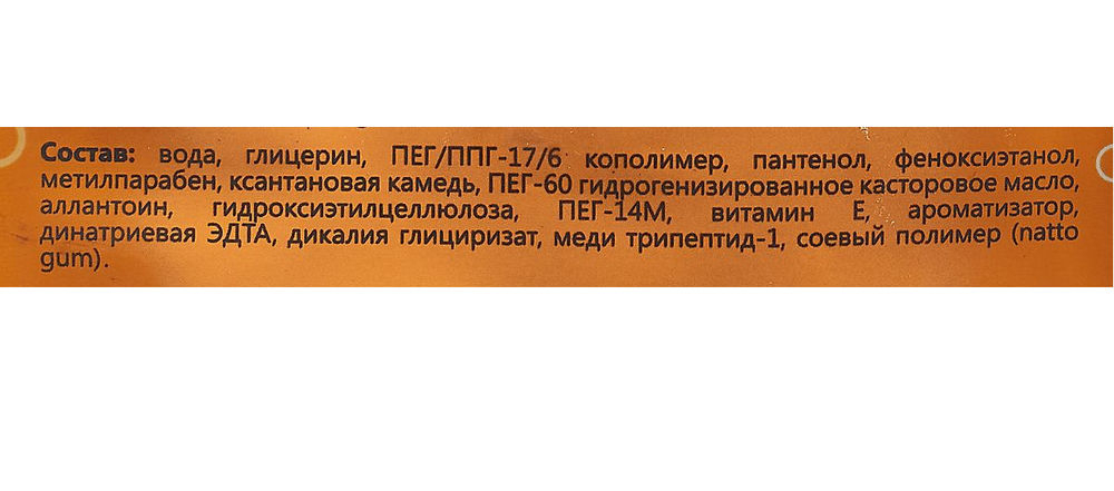 Вода, глицерин, ПЕГ/ППГ-17/6 кополимер, пантенол, феноксиэтанол, метилпарабен, ксантановая камедь, ПЕГ-60 гидрогенизированное касторовое масло, аллантоин, гидроксиэтилцеллюлоза, ПЕГ-14М, витамин Е, ароматизатор, динатриевая эдта, дикалия глициризат, меди трипептид-1, соевый полимер (natto gum).