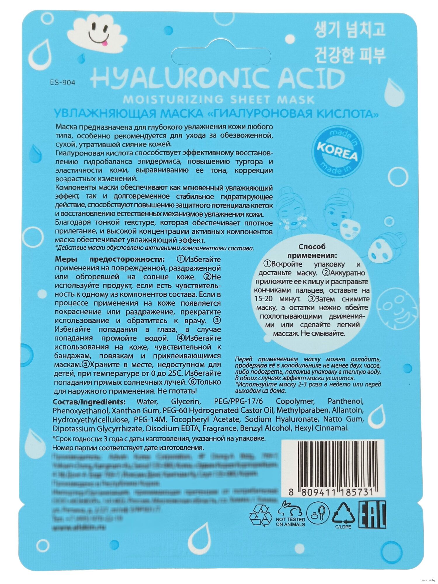 Вскройте упаковку и достаньте маску. Аккуратно приложите ее к лицу и расправьте кончиками пальцев, оставьте на 15-20минут. Затем снимите маску, а остатки нежно вбейте похлопывающими движениями или сделайте легкий массаж. Не смывайте.Состав