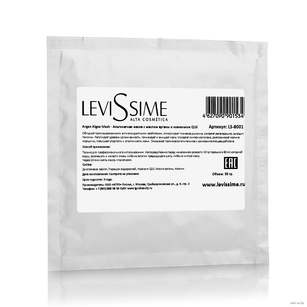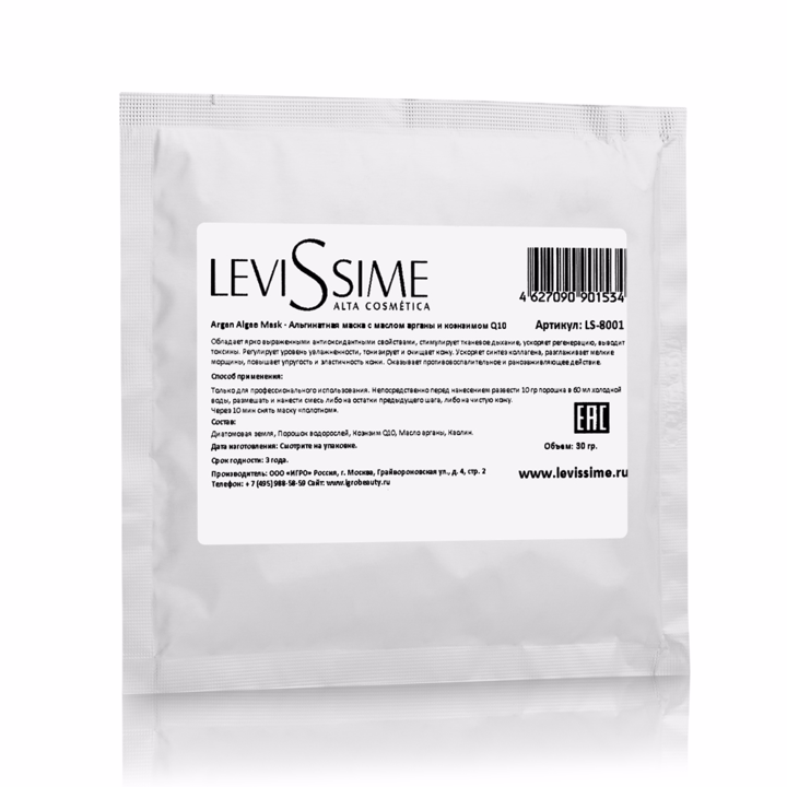 Альгинатная маска Levissime с маслом арганы и коэнзимом Q10 обладает ярко выраженными антиоксидантными свойствами, стимулирует тканевое дыхание, ускоряет регенерацию, выводит токсины. Регулирует уровень увлажненности, тонизирует и очищает кожу. Ускоряет синтез коллагена, разглаживает мелкие морщины, повышает упругость и эластичность кожи. Оказывает противовоспалительное и ранозаживляющее действие.