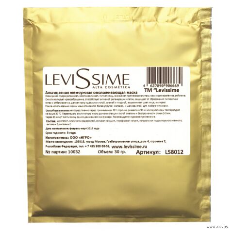 Омолаживающая альгинатная маска Levissime с жемчужной пудрой увлажняет, восстанавливает, питает кожу, оказывает противовоспалительное и противоотёчное действие. Она стимулирует кровообращение, способствует активной регенерации клеток, защищает от образования пигментных пятен и отбеливает их, делает кожу идеально чистой, свежей и гладкой, выравнивает цвет лица, матирует. После использования маски кожа становится более упругой, матовой, и шелковистой. Для любого типа кожи.